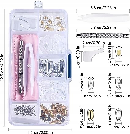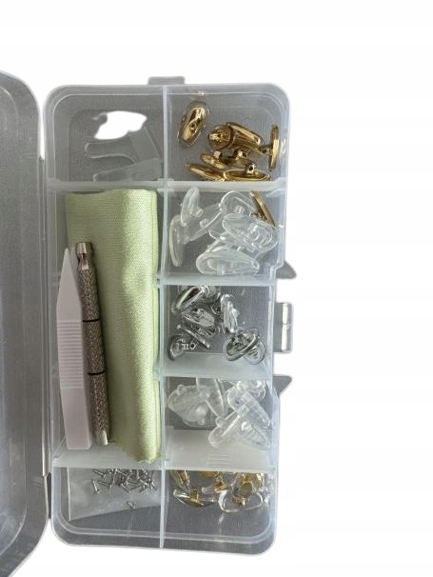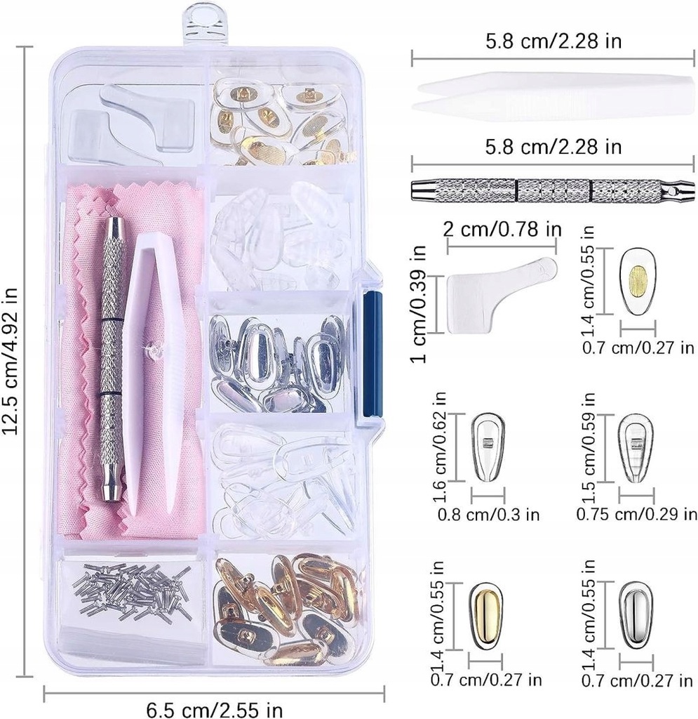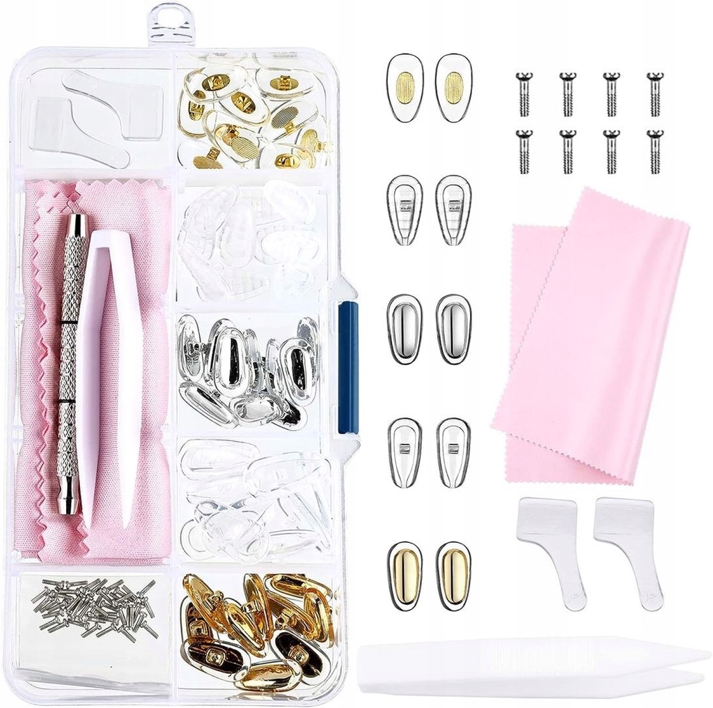 Zestaw do naprawy okularów: zestaw śrub do okularów przeciwsłonecznych zawiera 40 śrub do okularów, 25 par silikonowych nosków, 1 parę zaczepów na uszy, 1 plastikową pincetę, 1 mini śrubokręt i ściereczkę z włókna szklanego. Jest dobrym dodatkiem do naprawy okularów i okularów przeciwsłonecznych itp.