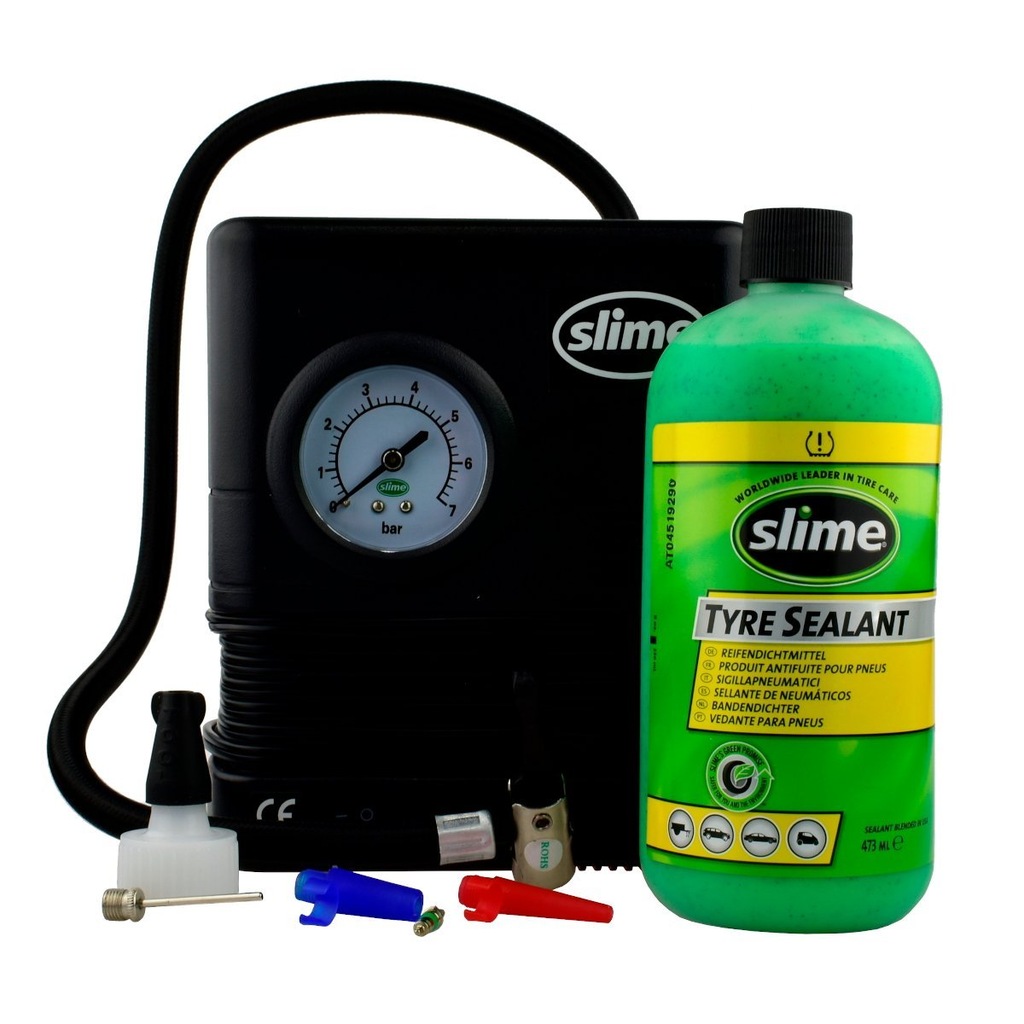 Każdy zestaw zawiera wysokiej jakości uszczelniacz Slime oraz kompresor 12 V o różnej mocy.
