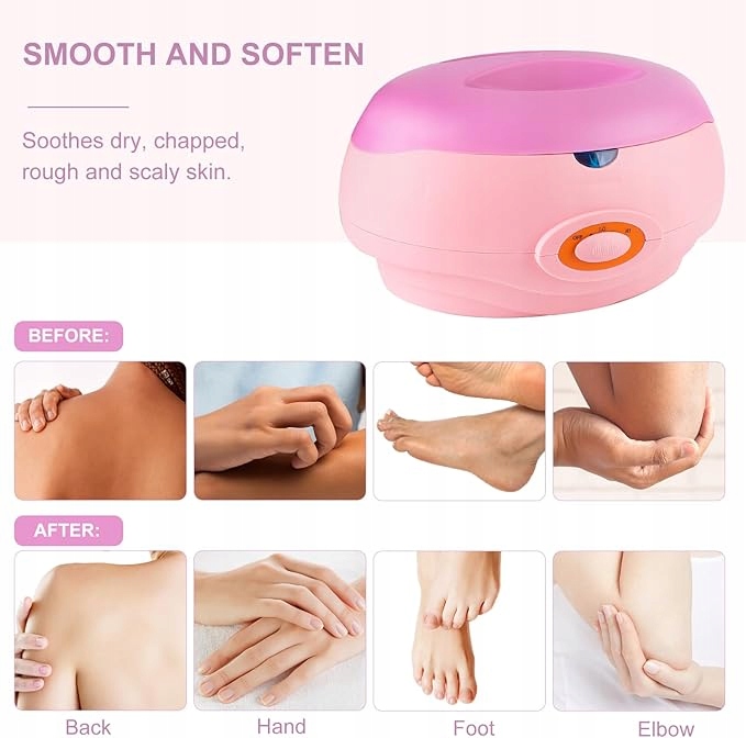 Podgrzany wosk parafinowy daje ciepło, sprawia, że szorstka i sucha skóra staje się delikatna i gładka, wspomaga wchłanianie substancji pielęgnacyjnych i nawilżenie oraz wspomaga krążenie krwi. Nanieść na skórę dłoni, stóp i łokci.
