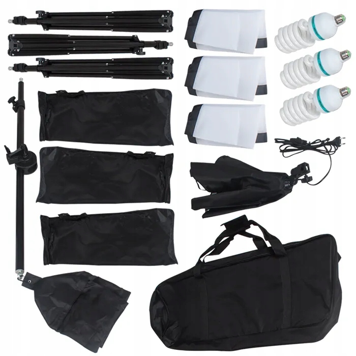 - Kompletny zestaw Studio: 3x Statyw + 1x szubienica + 3x żarówki + 3x Softboxy + torba