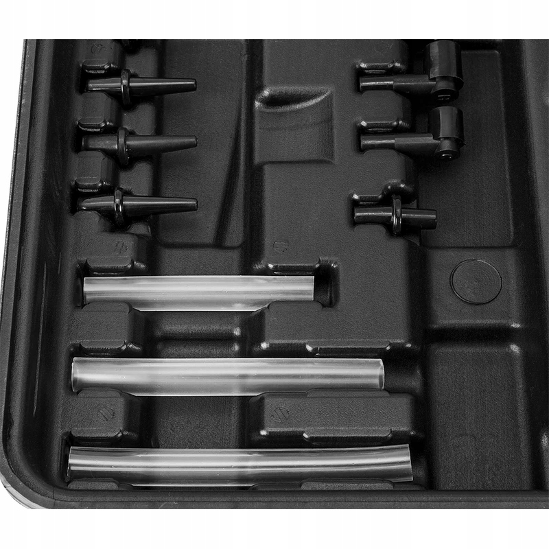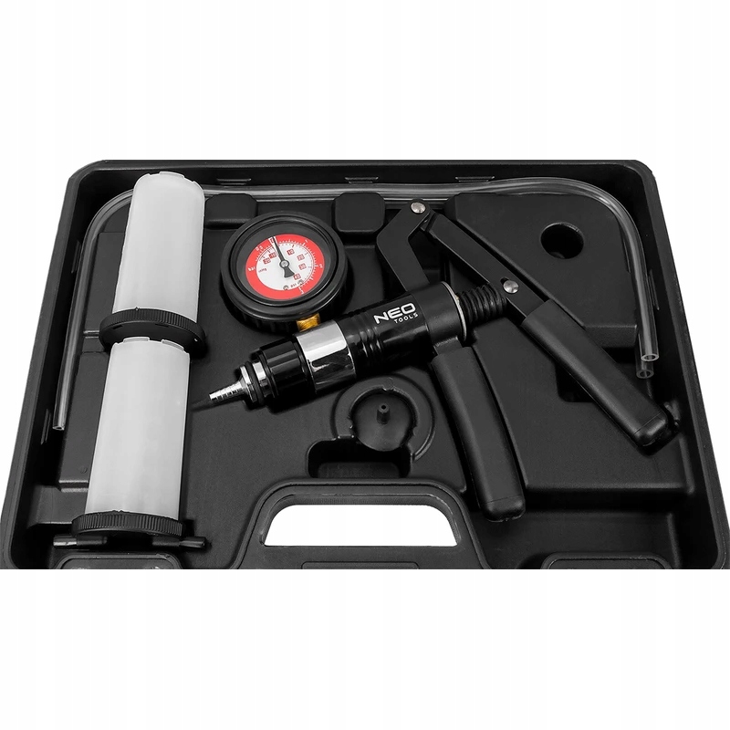 Zestaw do odpowietrzania układów hamulcowych oraz sprzęgła, układu wspomagania kierownicy; do sprawdzania czujników podciśnienia, zaworu recyrkulacji spalin, przepustnicy, regulatora ciśnienia paliwa, modulatora ciśnienia w automatycznych skrzyniach biegów Zestaw zawiera zbiorniki, przewody i adaptery do odpowietrzania układów hamulcowych i sprzęgłowych Zakres pracy manometru - od -1 bara do 3 barów