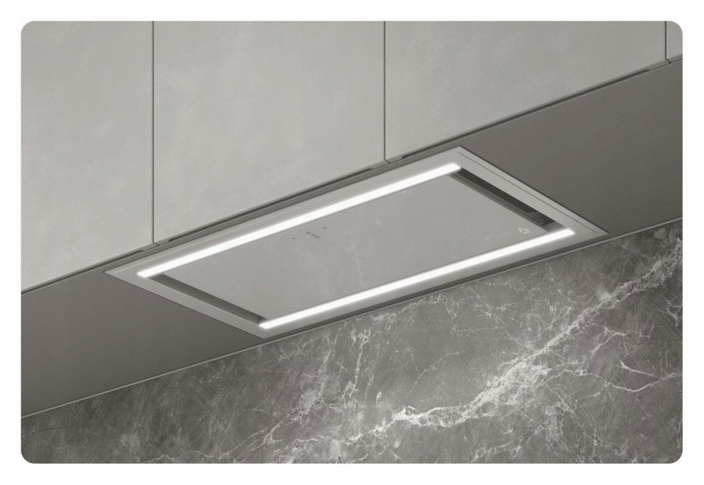 Stalowa, lakierowana ramka wokół okapu, zabezpiecza płytę meblową przed wilgocią a szkło zastosowane w centralnej części urządzenia, jest maksymalnie proste w utrzymaniu czystości.