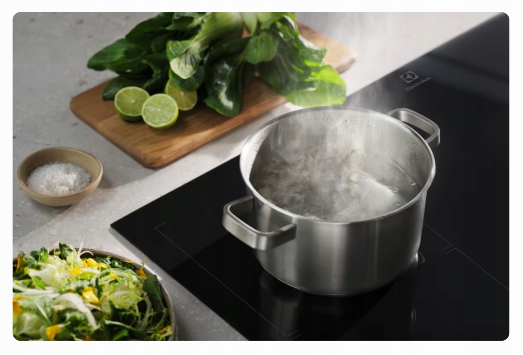 Płyty indukcyjne z funkcją PowerBoost nagrzewają się dwa razy szybciej niż promiennikowe. Wydajność i natychmiastowe osiąganie temperatury.