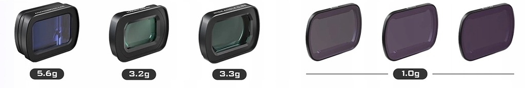 makro: 3.2 g, obiektyw anamorficzny: 5.6 g, obiektyw szerokokątny + makro: 6.5 g, filtr ND: 1 g