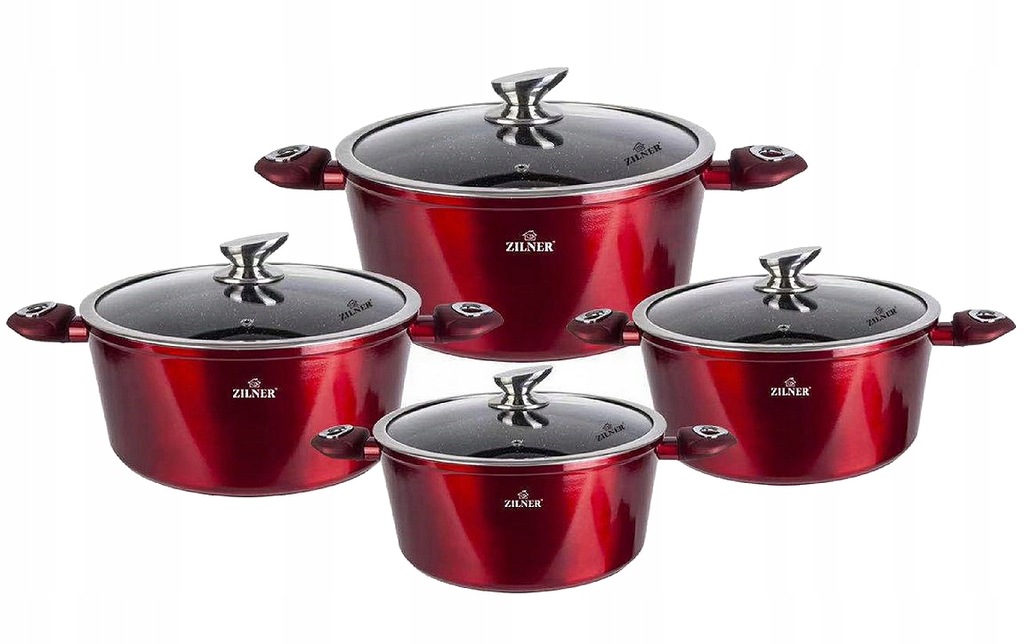Nowoczesny komplet marmurowych garnków w połysku. Zestaw składa się z 8 elementów, czyli 4 garnków z pokrywkami. Naczynia posiadają indukcyjne dna. Szklane pokrywki posiadają eleganckie, stalowe uchwyty, oraz odpowietrzniki pary. Uchwyty garnków odporne na nagrzewanie się, pewnie się je trzyma w dłoniach.