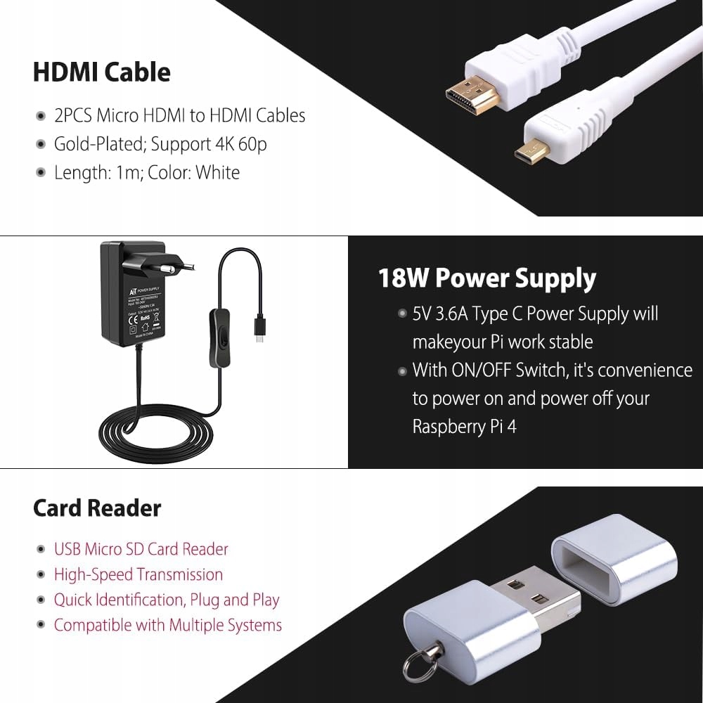 ⚜️Kompleksowy zestaw: Zawiera zasilacz 5V/3.6A z włącznikiem, dwa kable HDMI 4K, czytnik kart SD oraz instrukcję obsługi.