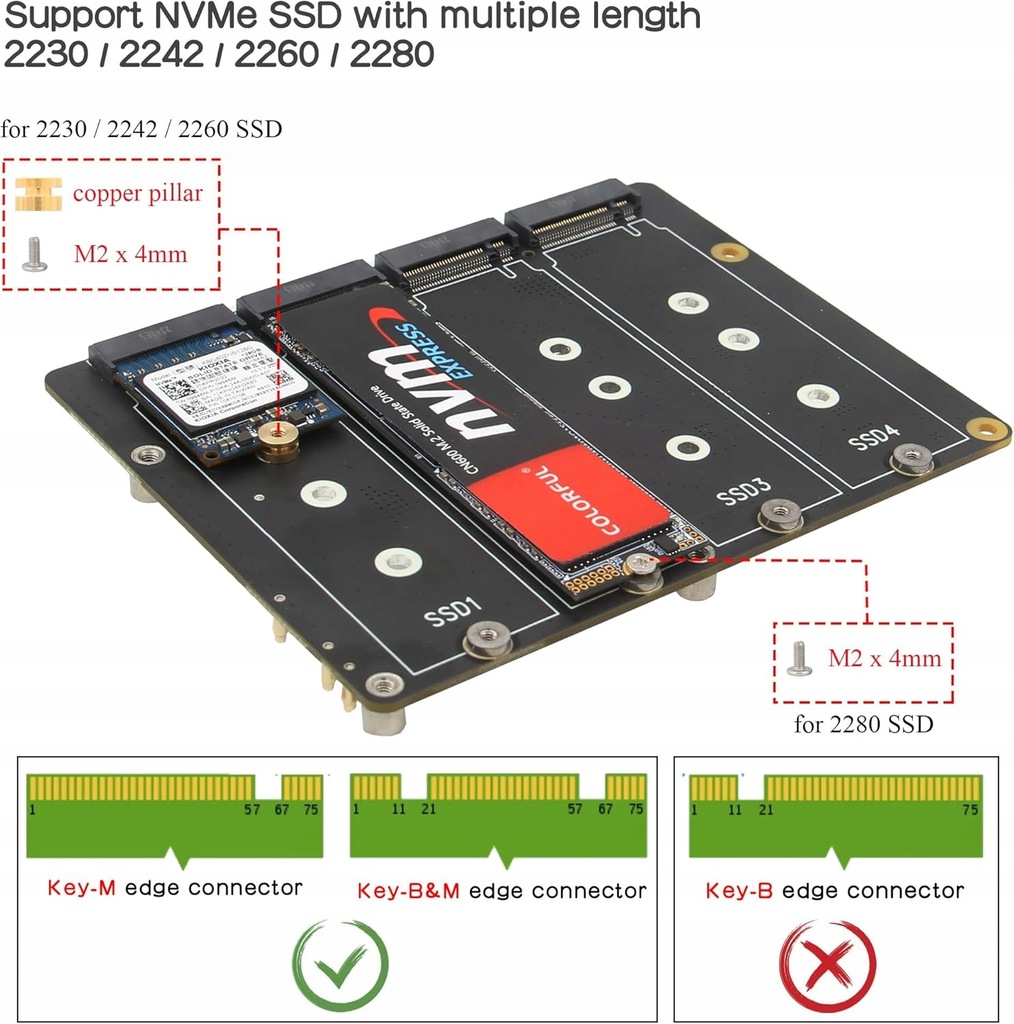⋆ Obsługuje 4 dyski SSD M2 NVMe: Obsługuje dyski SSD M.2 KEY-M NVMe o długości instalacji 2230/2242/2260/2280. W zestawie miedziany słupek SSD do instalacji dysków SSD 2230/2242/2260