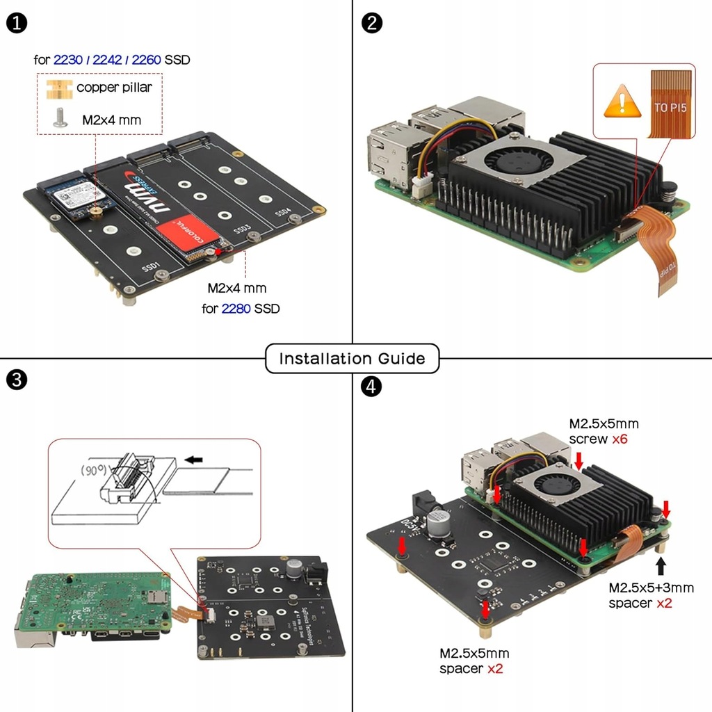 ZESTAW GEEKWORM X1011 PCIe 4PCS M.2 Key-M NVMe SSD DLA RASPBERRY Pi 5