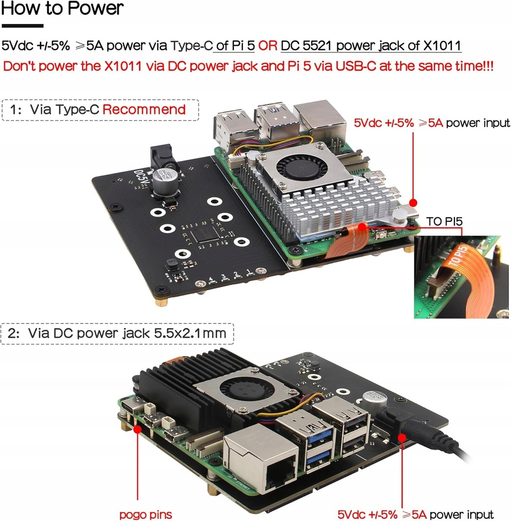 ⋆ Jak zasilać: Zasilanie przez oba piny pogo i gniazdo zasilania FFC lub DC, zapewniające wystarczające zasilanie. Zalecamy użycie zasilacza Geekworm PD 27 W (ASIN: B0CZCZF2QV). Nie zasilaj X1011 przez gniazdo zasilania DC i Raspberry Pi5 przez USB-C w tym samym czasie!