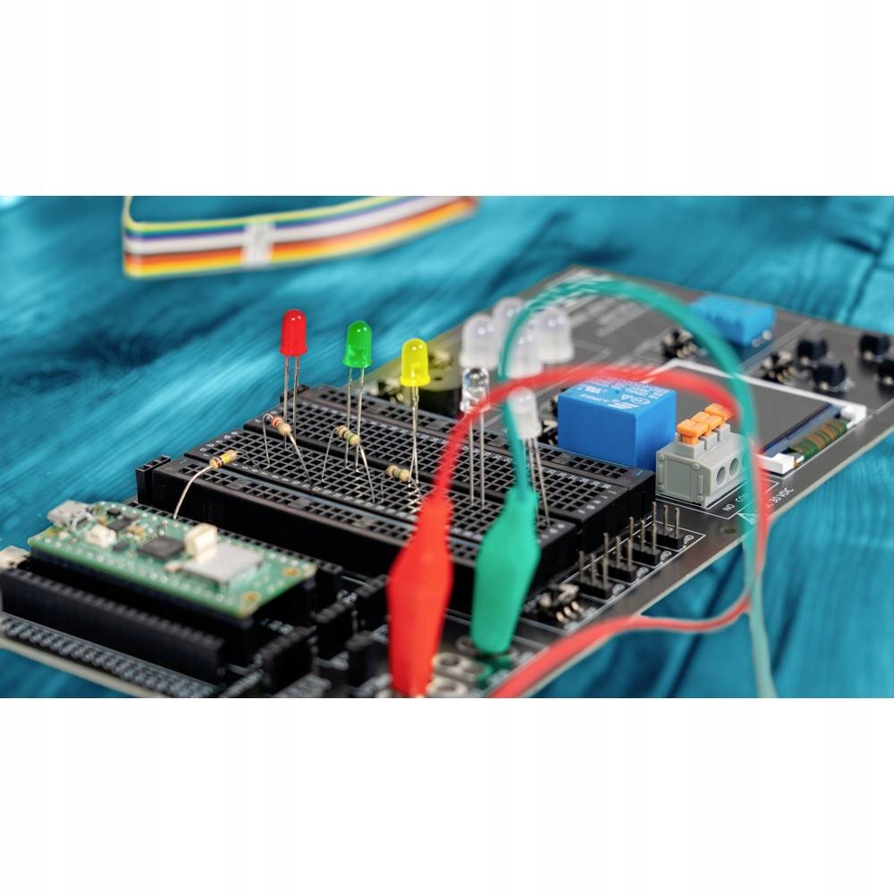 - 3x diody LED w różnych kolorach 6x rezystory 1x fotodioda 1x dioda LED RGB 1 x brzęczyk Kabel micro USB Kabel łączący Zaciski krokodylkowe Oryginalny zasilacz Raspberry Pi USB-C Serwomotor Enkoder obrotowy Czujnik ultradźwiękowy Czujnik UV Raspberry Pi Pico WH Płytka Explorer z wbudowanym Breadboard