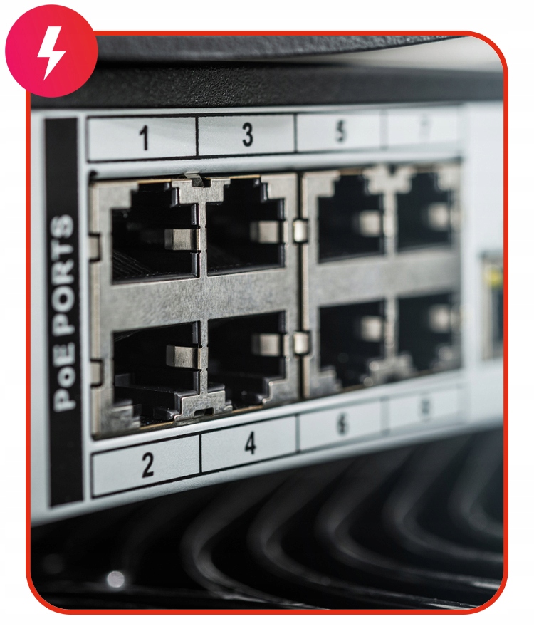 - Switch PoE: Umożliwia zasilanie kamer bezpośrednio przez kabel Ethernet, eliminując potrzebę dodatkowych zasilaczy.