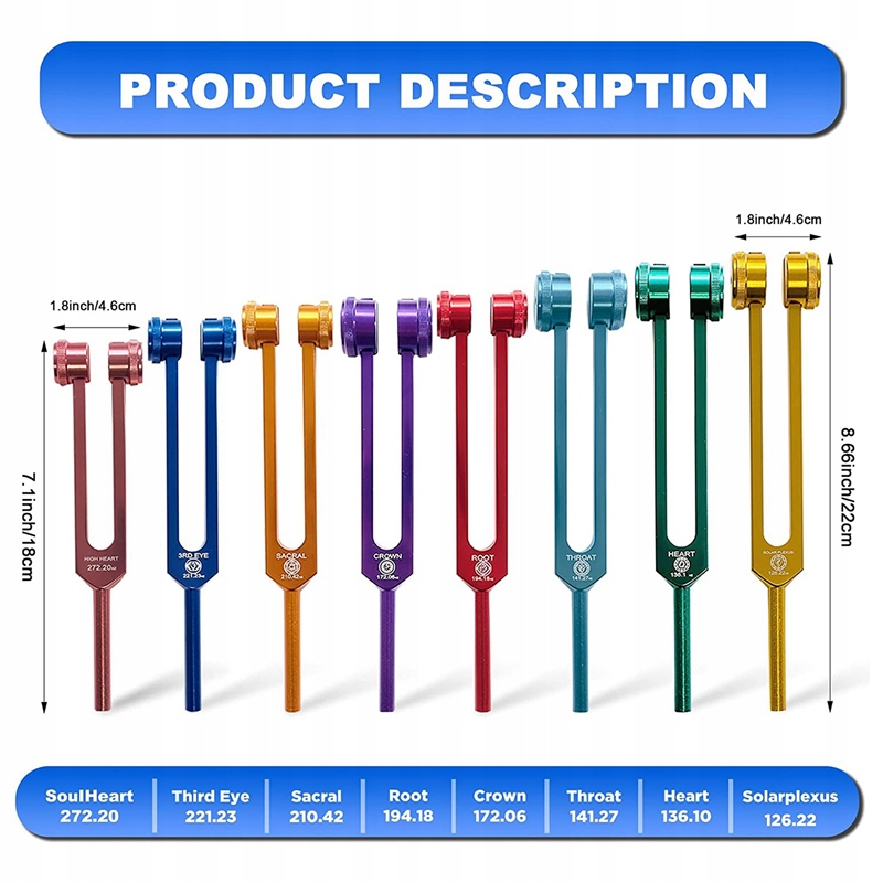 Zestaw kamertonów czakralnych wykonany jest z wysokiej jakości stopu aluminium o odporności na korozję, dłuższym dźwięku i precyzyjnej częstotliwości