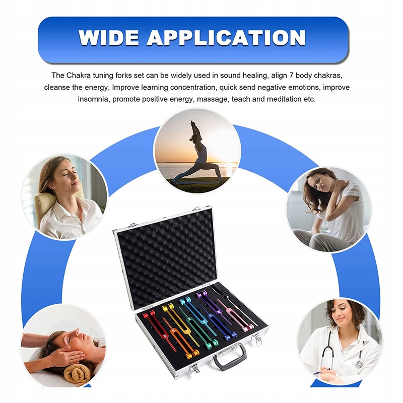Zestaw kamertonów czakralnych może być szeroko stosowany w uzdrawianiu dźwiękiem, wyrównywaniu 7 czakr ciała, oczyszczaniu energii, poprawie koncentracji w nauce, szybkim wysyłaniu negatywnych emocji, poprawie bezsenności, promowaniu pozytywnej energii, masażu, nauczaniu i medytacji itp.