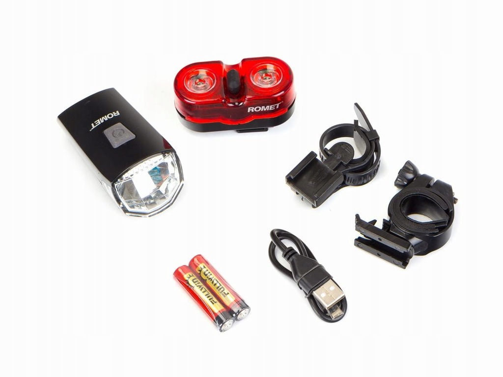 Zestaw lamp przód 1-LED, tył 2-LED. Z uchwytami mocującymi do rury kierownicy i wspornika siodła. Przód ładowanie USB - przewód w zestawie, tył baterie 2 x AAA w zestawie.