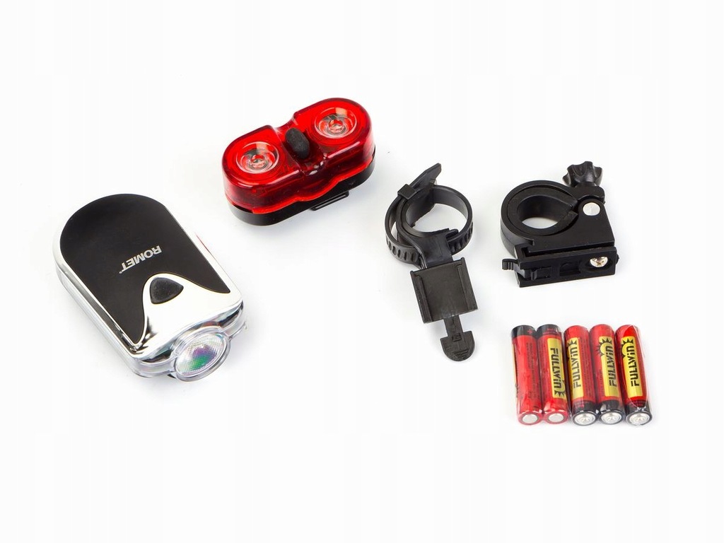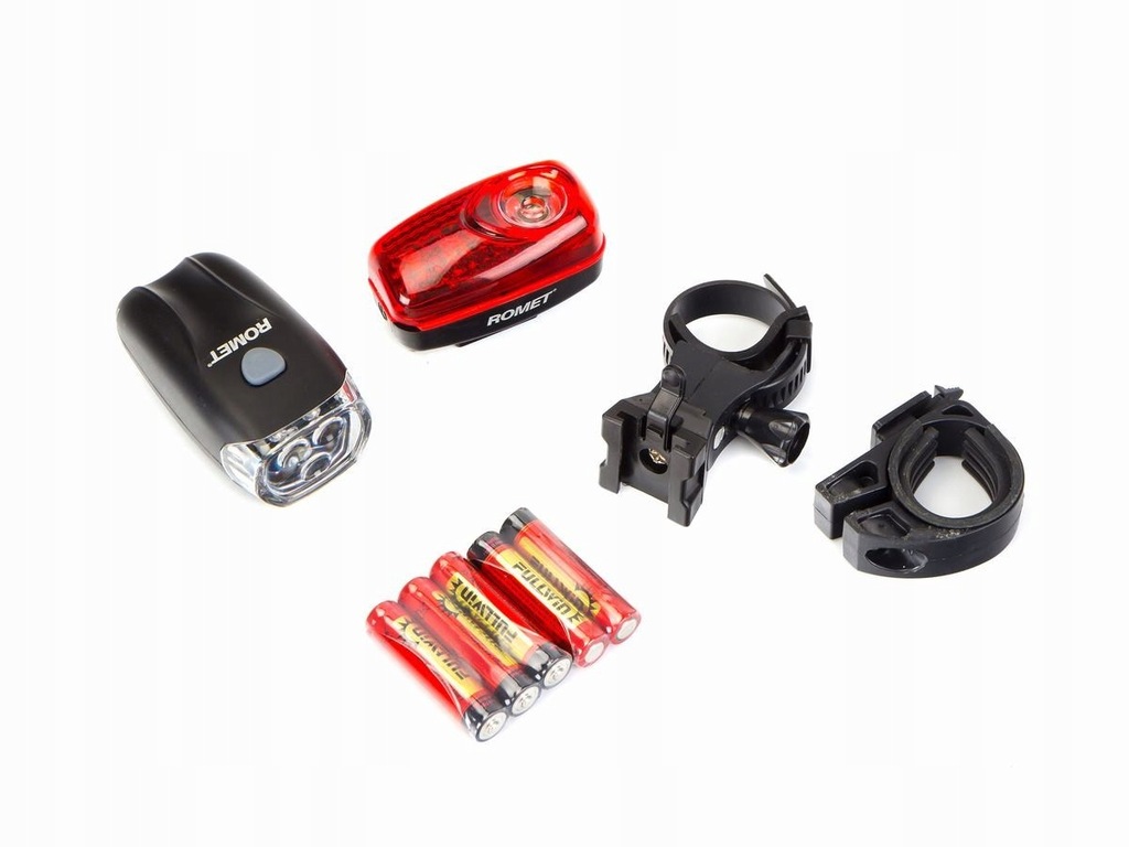 Zestaw lamp- przód 1-LED, tył 2-LED. Z uchwytami mocującymi do rury kierownicy i wspornika siodła. Zasilana bateryjnie. Baterie w zastawie.