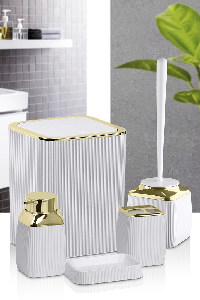 Wyjątkowy komplet łazienkowy Stripe Square składający się z 5ciu elementów, kolor biały z wykończeniem w kolorze złotym