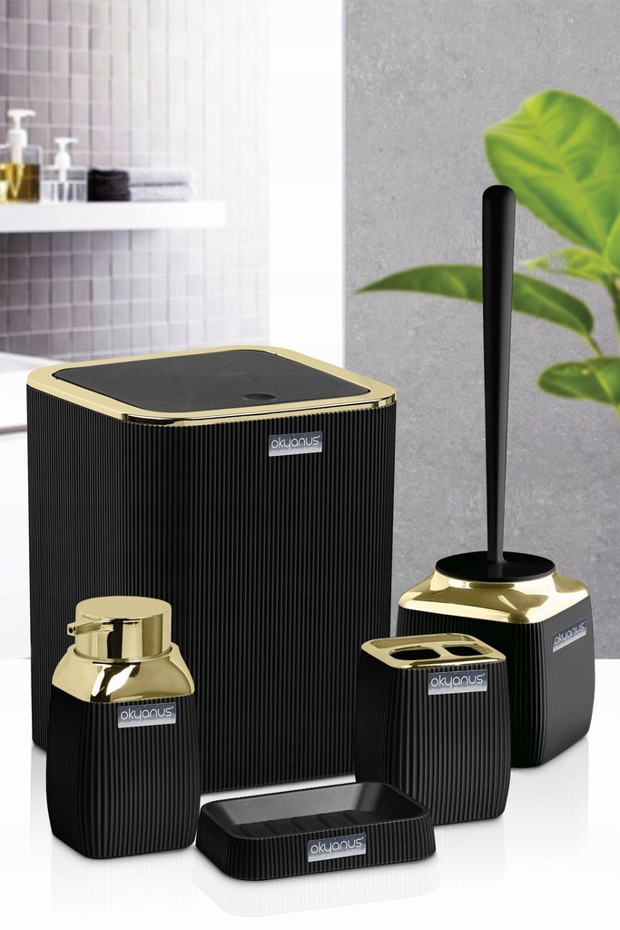 Wyjątkowy komplet łazienkowy Stripe Square składający się z 5ciu elementów, kolor czarny z wykończeniem w kolorze złotym