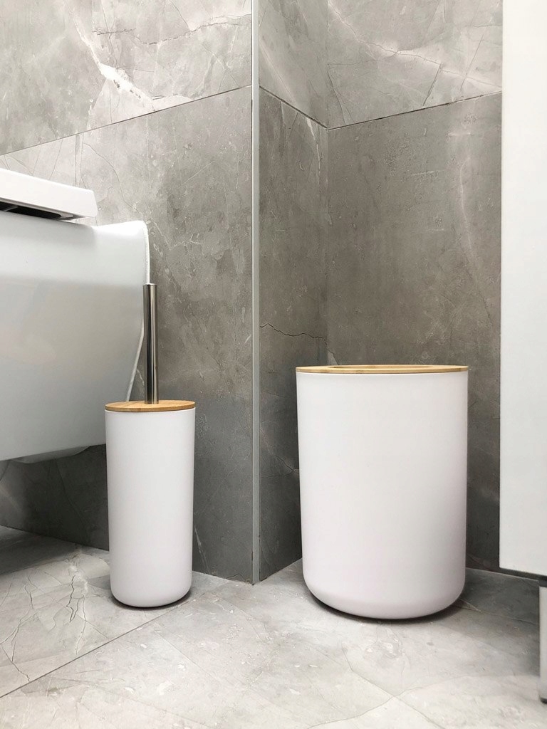 szczotka toaletowa z pojemnikiem oraz kosz na śmieci.