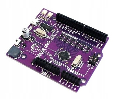 Cytron Maker Uno to płytka zgodna z Arduino UNO, oparta na popularnym mikrokontrolerze ATmega328P w wersji SMD z rodziny AVR. Do dyspozycji użytkownika jest 14 linii I/O, 6 kanałów PWM, 6 wejść analogowych oraz interfejsy komunikacyjne (UART, SPI, I2C). Układ CH340G realizuje komunikację przez interfejs USB. Dodatkowo na płyce znalazło się 12 diod LED, programowalny przycisk oraz wbudowany buzzer.