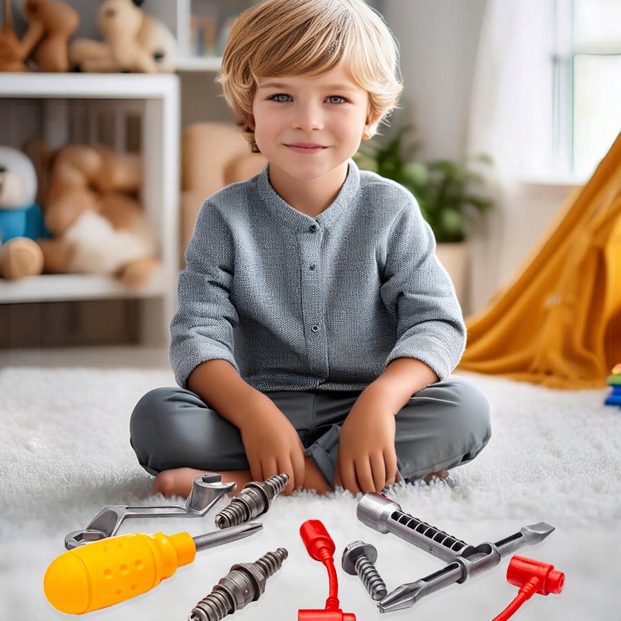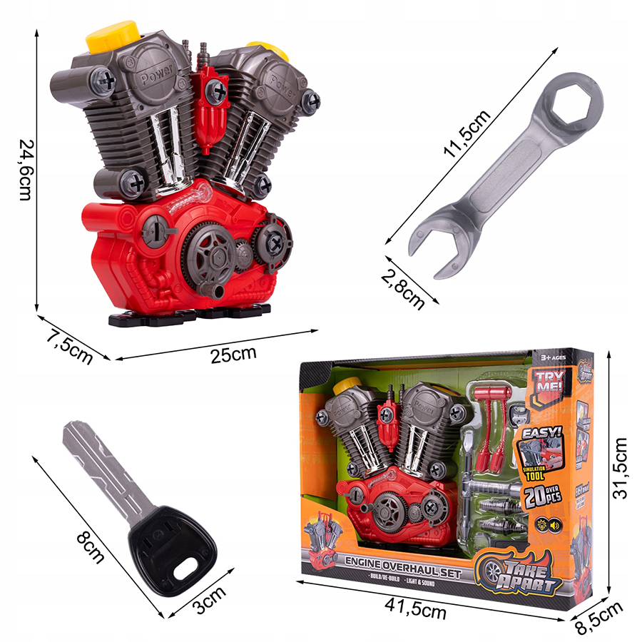 Dzięki różnorodnym narzędziom, takim jak śrubokręt, klucz nasadowy z dwoma końcówkami, klucz płaski, mały majsterkowicz może precyzyjnie skręcać i rozkręcać elementy silnika.