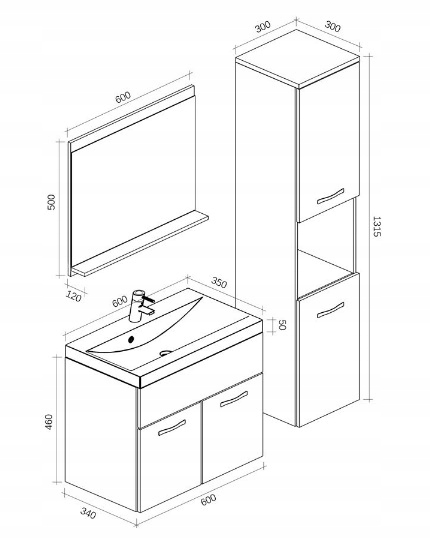 - Szafka pod umywalkę (47,2 x 60 x 35 cm) – funkcjonalna przestrzeń na niezbędne akcesoria łazienkowe.