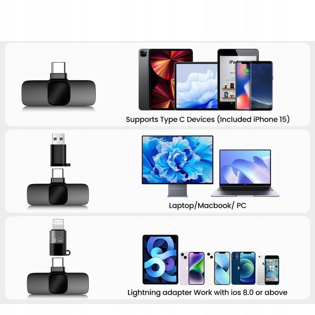 - Nasz bezprzewodowy mikrofon krawatowy 3 w 1 z adapterem jest kompatybilny z iPhone'ami (w tym iPhone'a 15), iPadami, urządzeniami z systemem Android (typ C) oraz komputerami. To i.dealne rozwiązanie do nagrywania wideo i podcastów.