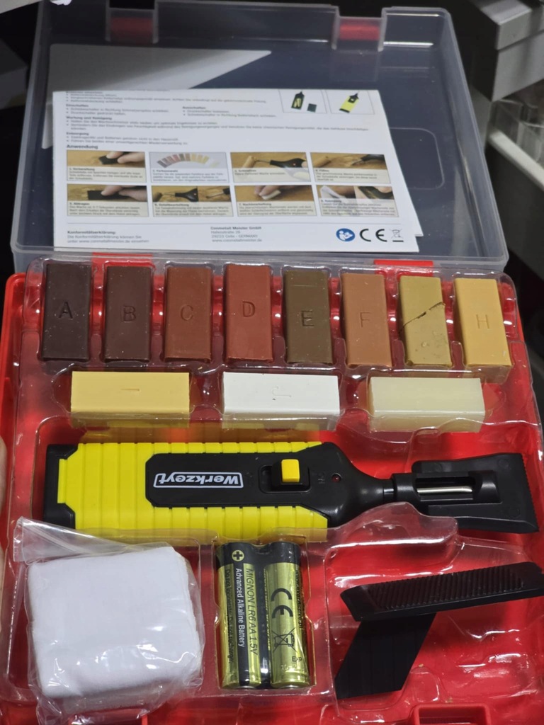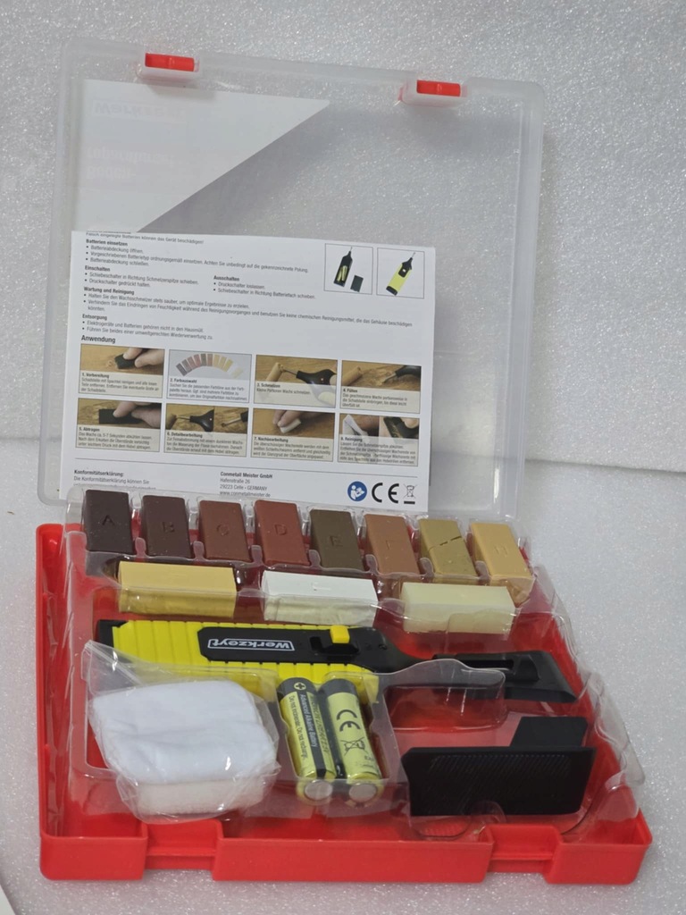 Zestaw umożliwia samodzielną naprawę uszkodzeń na powierzchniach drewnianych - drewnopodobnych. Można nim również naprawić uszkodzenia na powierzchniach kamienno - ceramicznych, w zależności od doboru pożądanego koloru wypełnienia. Dołączony do zestawu wosk naprawia głębokie rysy, pęknięcia, nawiercone otwory, otarcia i wyszczerbienia. 11 pałeczek woskowych w różnych kolorach pozwala na dobór właściwego koloru. Woski można dowolnie ze sobą mieszać w celu uzyskania odpowiedniego odcienia. Rozgrzany wosk wypełnia ubytek, a po wyschnięciu twardnieje i tworzy warstwę ochronną.