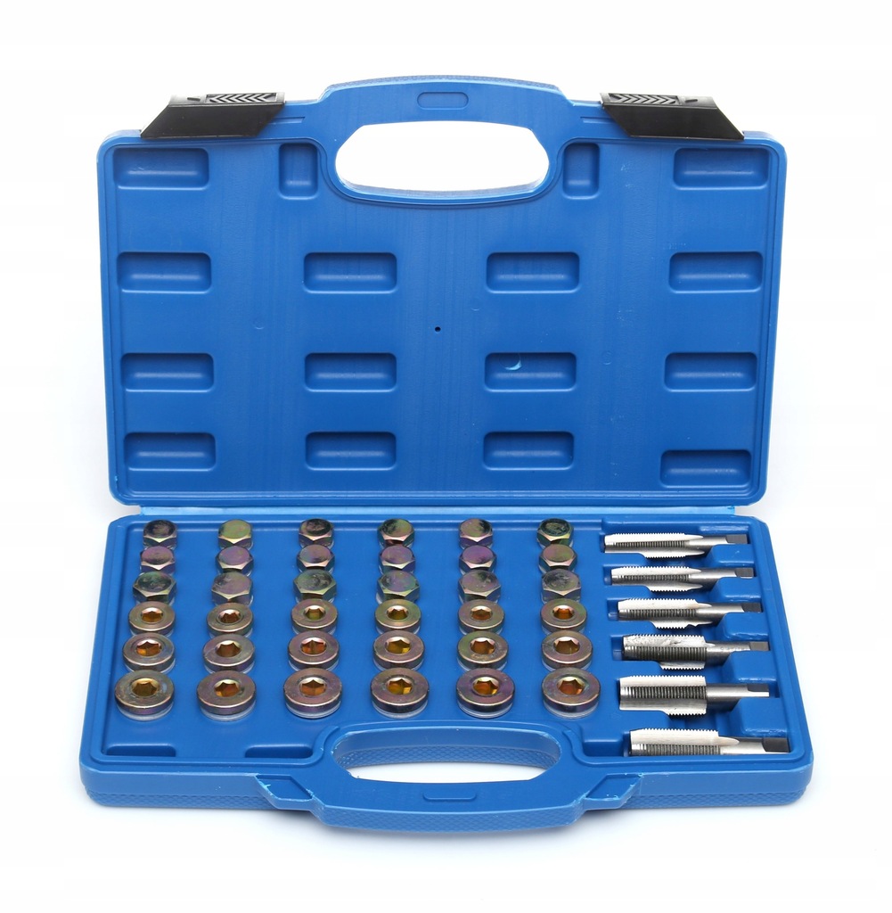 Profesjonalny zestaw klasy premium służący do naprawy gwintów korków spustowych miski olejowej, skrzyni biegów i innych. Pasuje do większości popularnych gwintów stosowanych w samochodach osobowych, a także w lekkich samochodach ciężarowych.