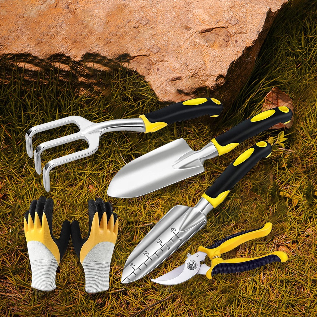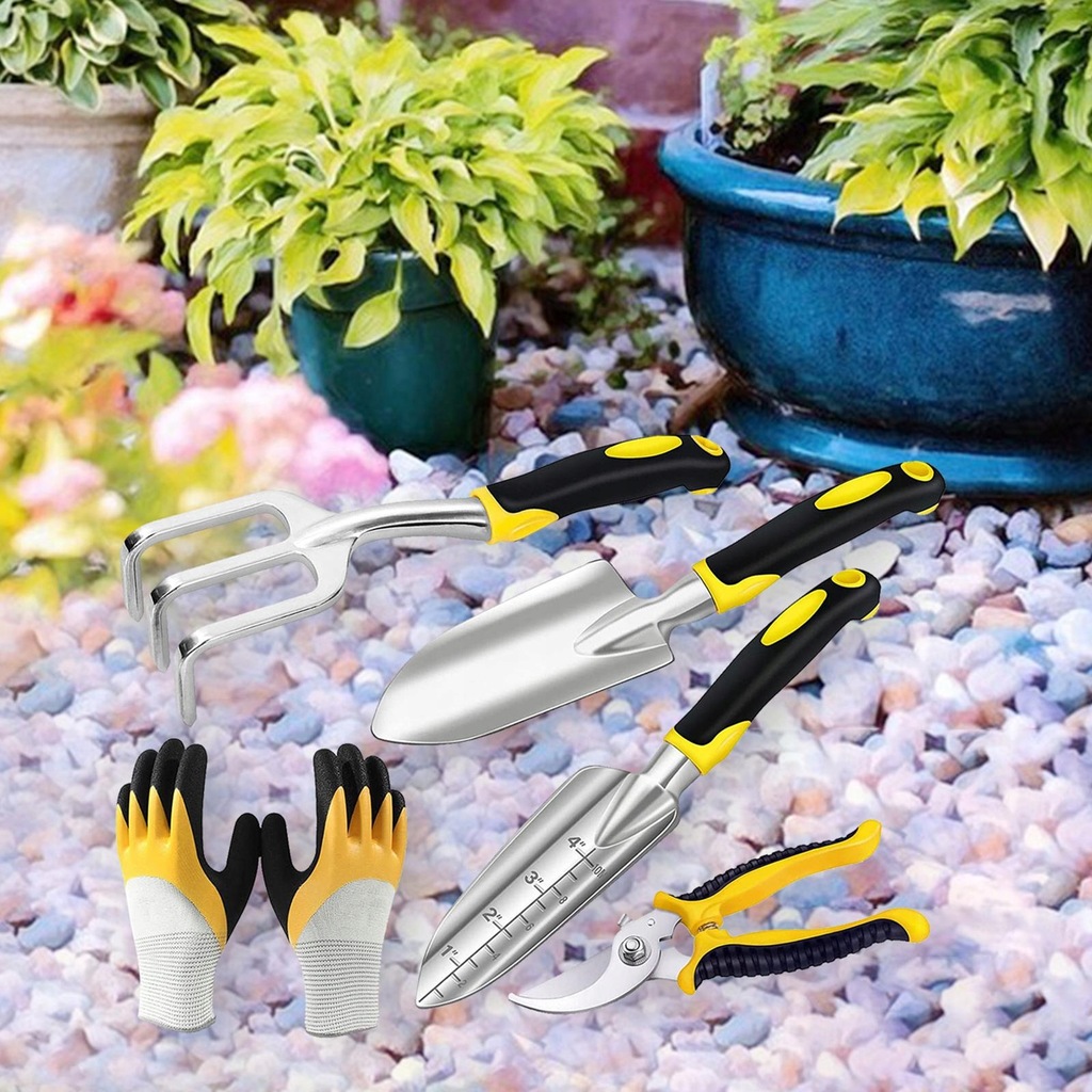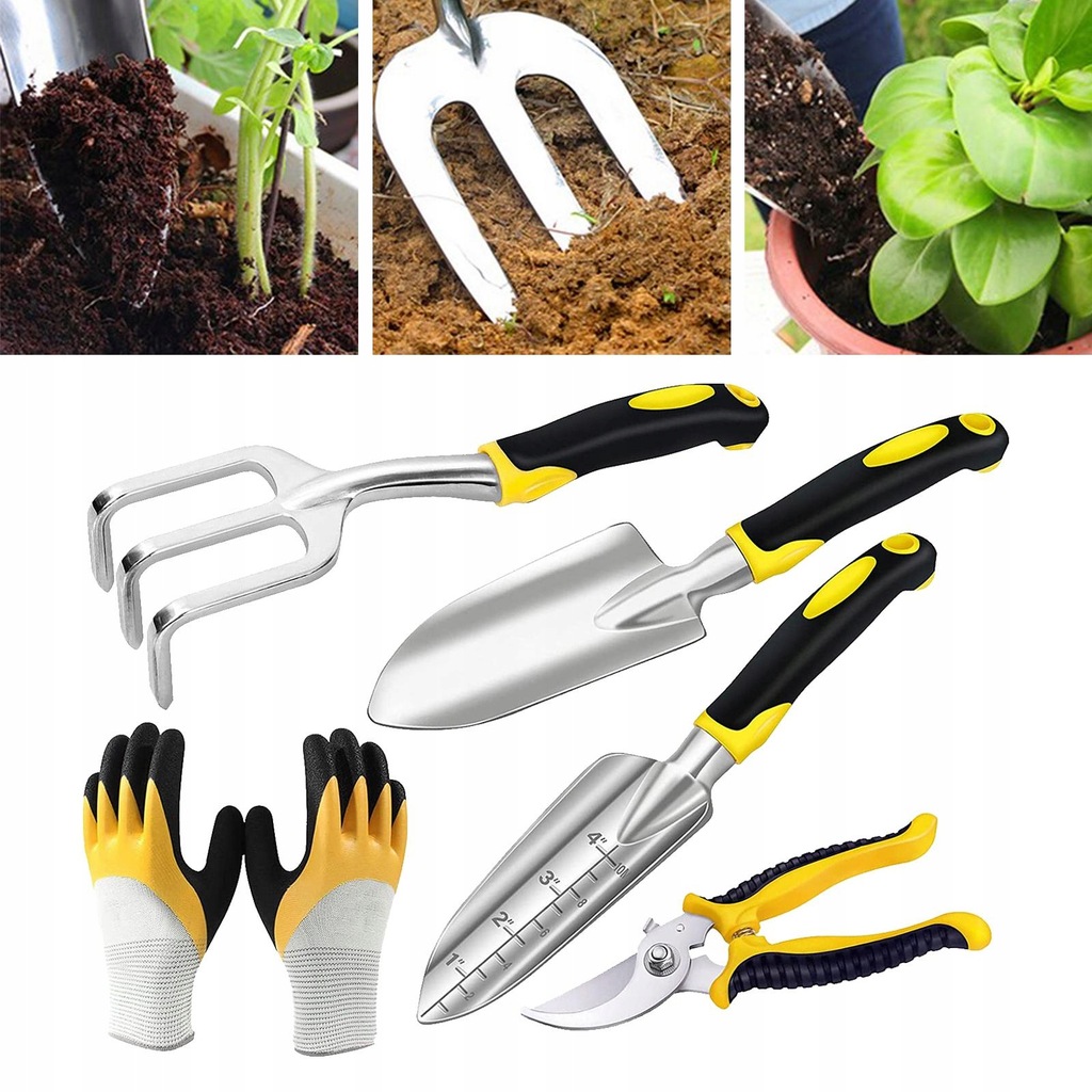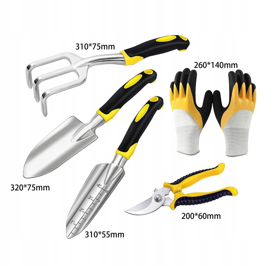 Zestaw 5 narzędzi ogrodowych, w tym kielnia ogrodowa, kielnia do przesadzania, kultywator/grabiarka, rękawice ręczne i ogrodowe.
