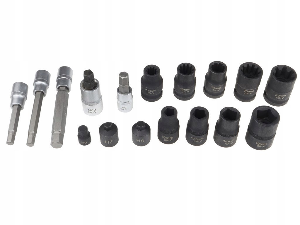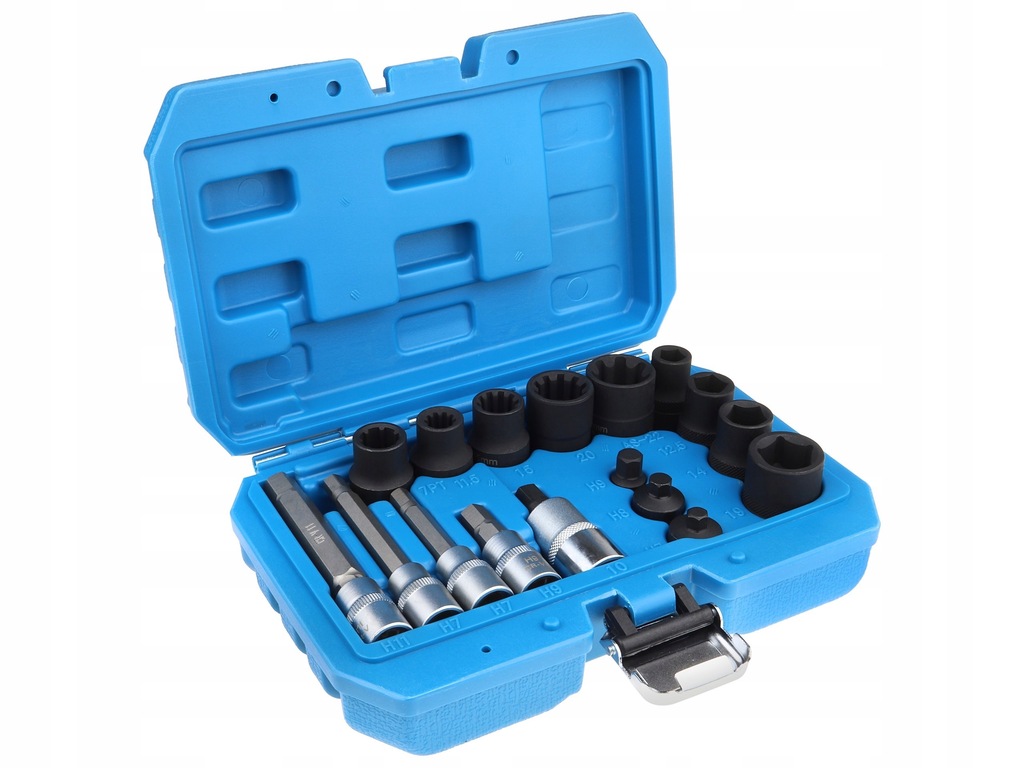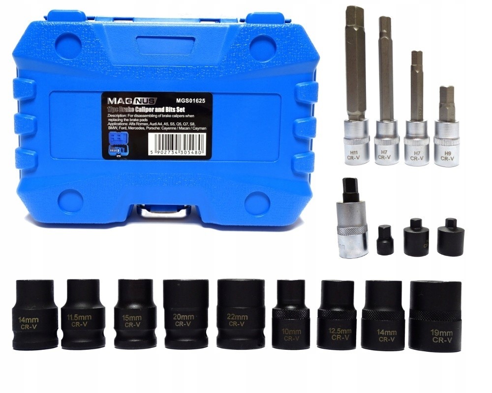 Zestaw zawiera 17 sztuk nasadek i zestaw bitów do zacisków hamulcowych.