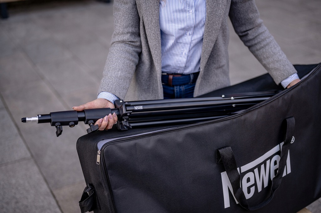 Dopełnieniem zestawu jest statyw Newell Talos – solidna, aluminiowa konstrukcja o imponującej maks. wysokości 280 cm i udźwigu aż do 6 kg. Dzięki szerokiemu rozstawowi nóg i blokowanym sekcjom zyskujesz pewność, że Twoje światło pozostanie dokładnie tam, gdzie je ustawisz – bez chybotania i stresu. Niezależnie od tego, czy pracujesz z lekkim panelem LED, czy cięższą konfiguracją z akumulatorami, Talos gwarantuje pełną stabilność.