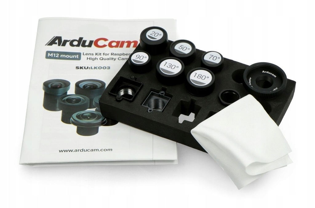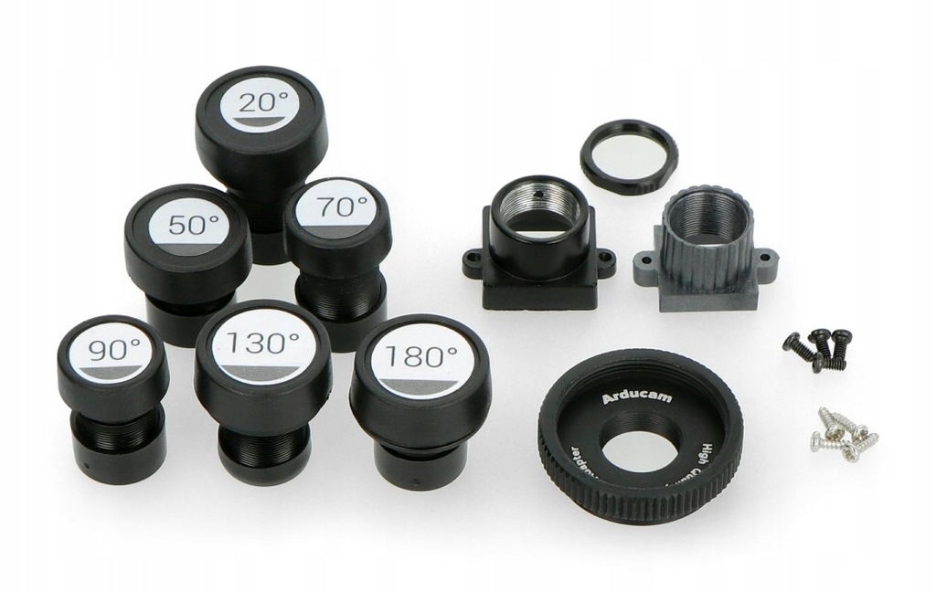 Zestaw 6 obiektywów M12 Mount o polu widzenia od 20° do 180° oraz ogniskowej od 1,56 mm do 25 mm. Zestaw zawiera także adapter umożliwiający wykorzystanie obiektywów z mocowaniem CS oraz C-CS, dzięki któremu możemy wykorzystać obiektyw w mikroskopii w połączeniu z kamerami Raspberry Pi V1 i V2, oraz odwrotnym mocowaniem kamery. Obiektywy są kompatybilne z kamerą Raspberry Pi HQ.