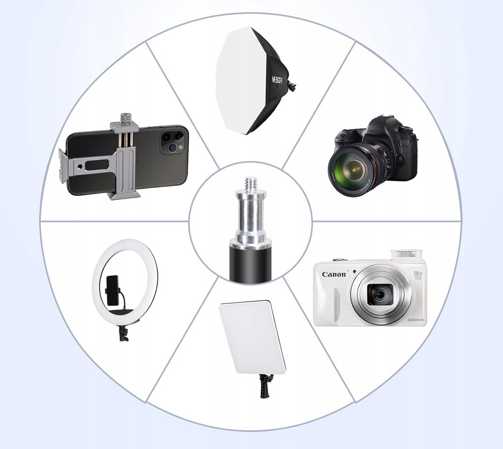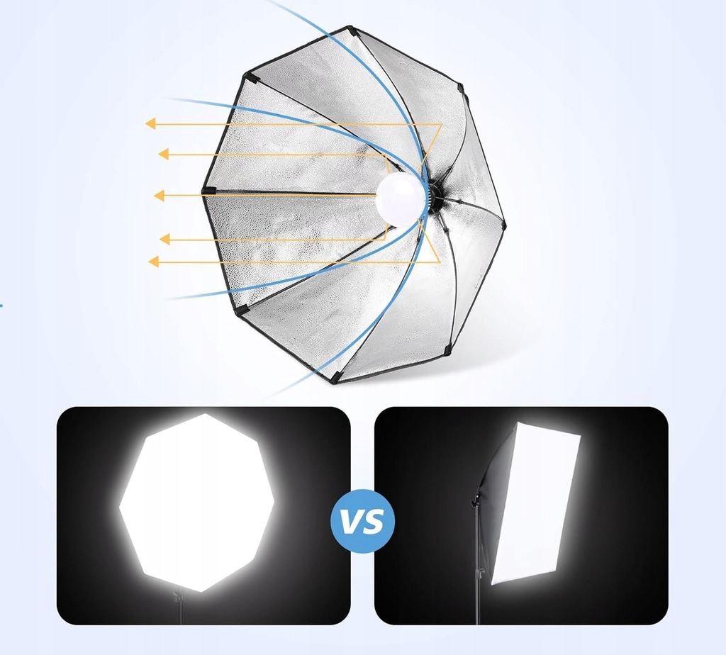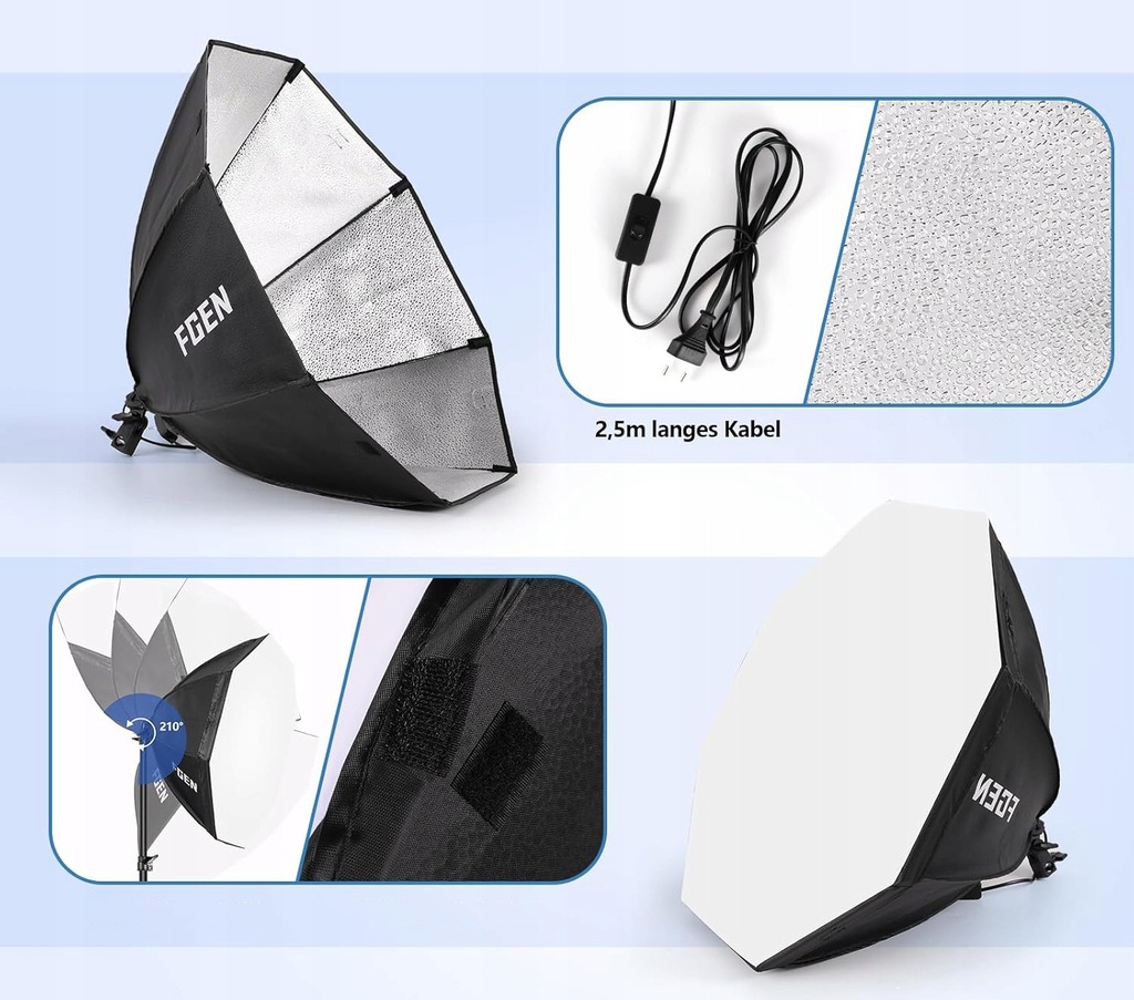 Ulepszony ośmiokątny zestaw do studia fotograficznego: Ośmiokątny softbox o średnicy 70 cm oraz biała miękka tkanina sprawiają, że światło jest jaśniejsze i oświetlany obszar jest większy. Gniazdo E27 może być podłączone bezpośrednio do żarówek, lamp fluorescencyjnych lub lamp błyskowych. Lampa może być obracana o 210°, aby uzyskać najlepszy kąt oświetlenia. Podstawa lampy wykonana jest z wysokiej jakości stopu aluminium i może być regulowana od 68 cm do 200 cm.