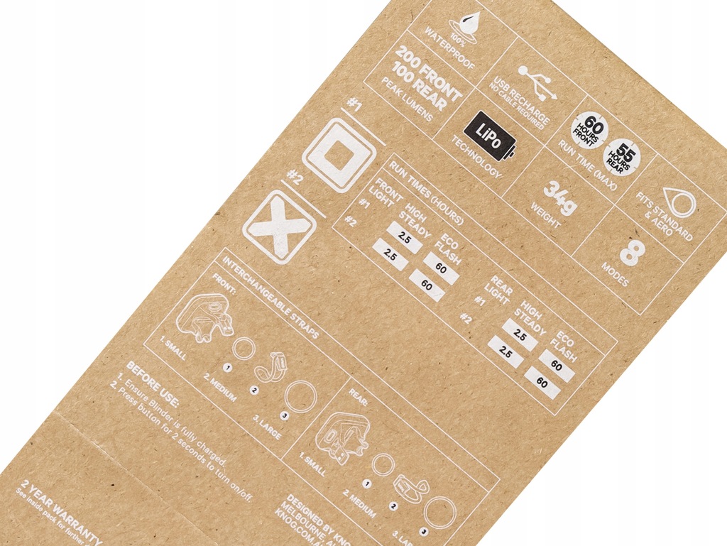 Blinder ma zintegrowane ładowanie USB, jest w 100% wodoodporny i ma niesamowity 60-godzinny czas pracy (55h tył) w trybie eco flash.