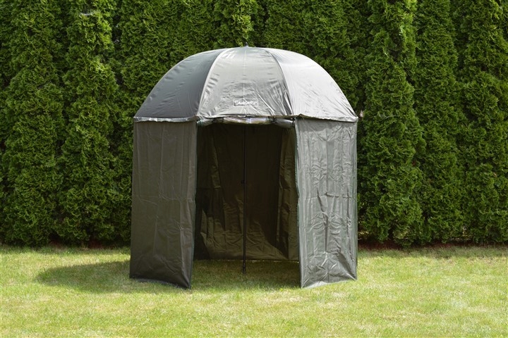 W parasolu można umieścić dwa fotele/krzesełka wędkarskie plus stolik.
