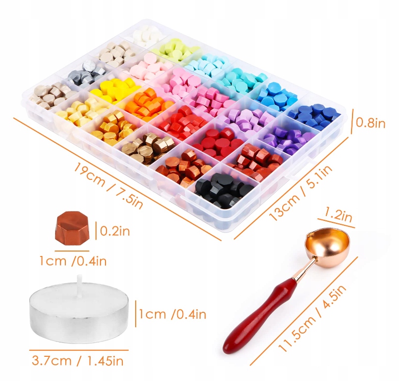 Zestaw zawiera 600 sztuk koralików woskowych, łyżeczkę oraz podgrzewacze, abyś mógł z łatwością dodać osobisty i stylowy akcent do swoich dokumentów, zaproszeń czy listów.