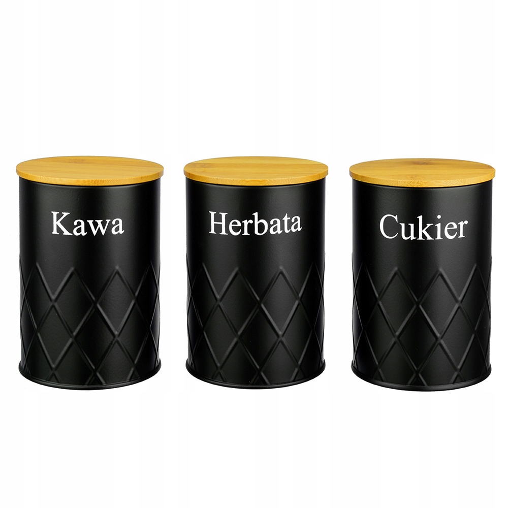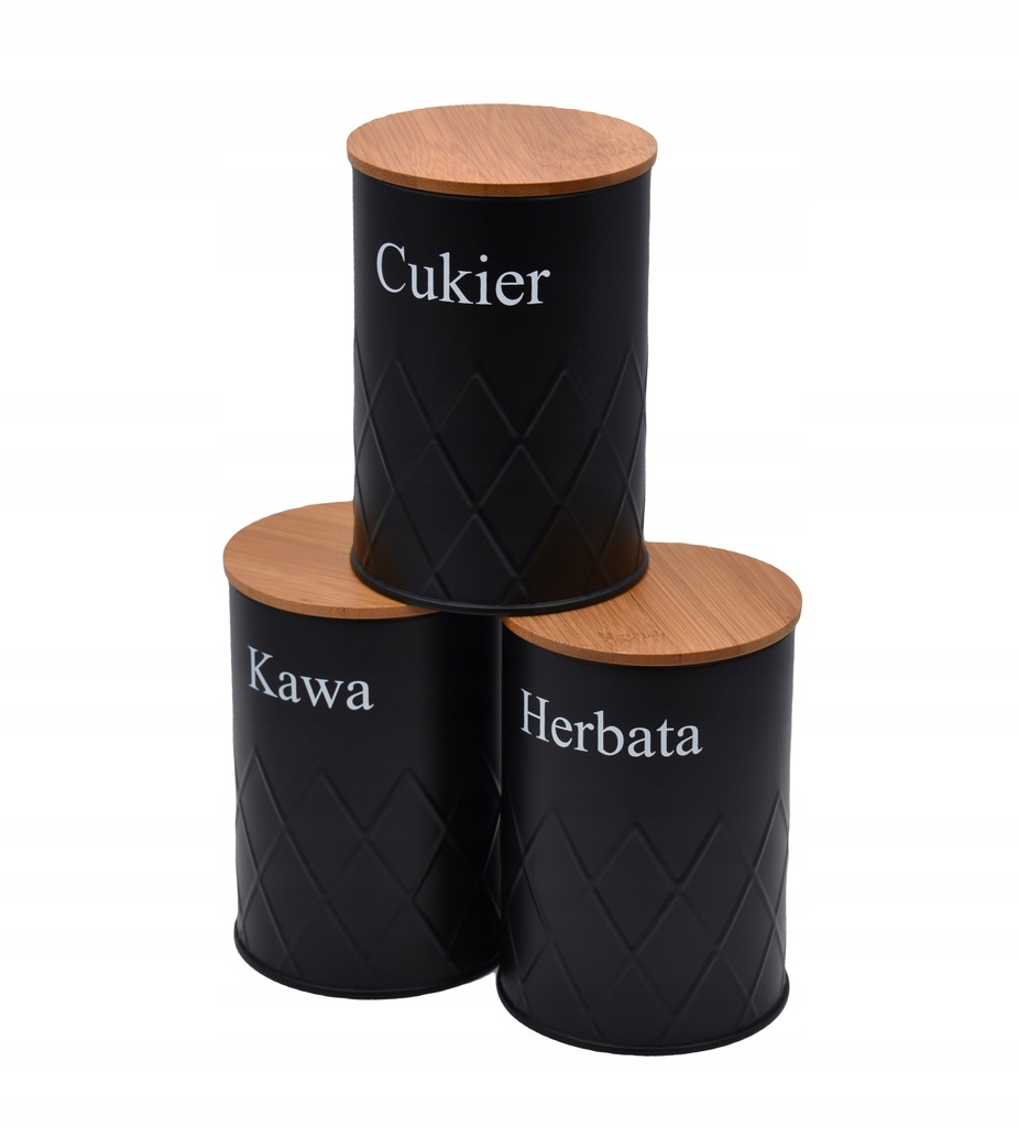 Na pojemnikach napisy Kawa, Herbata, Cukier.