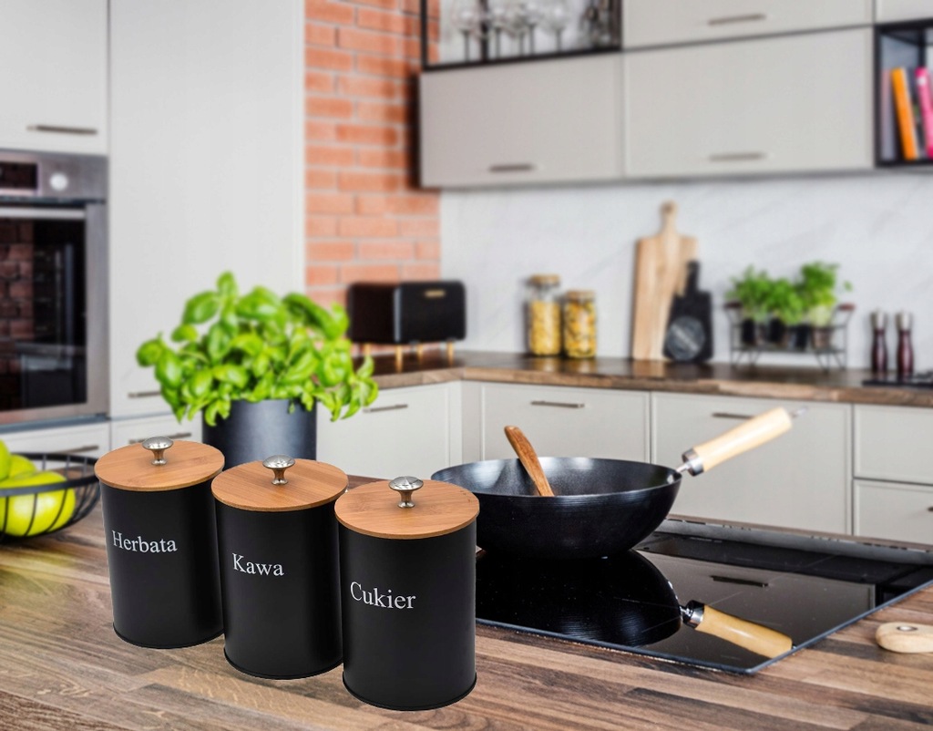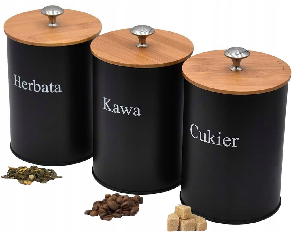 Na pojemnikach napisy Kawa, Herbata, Cukier.