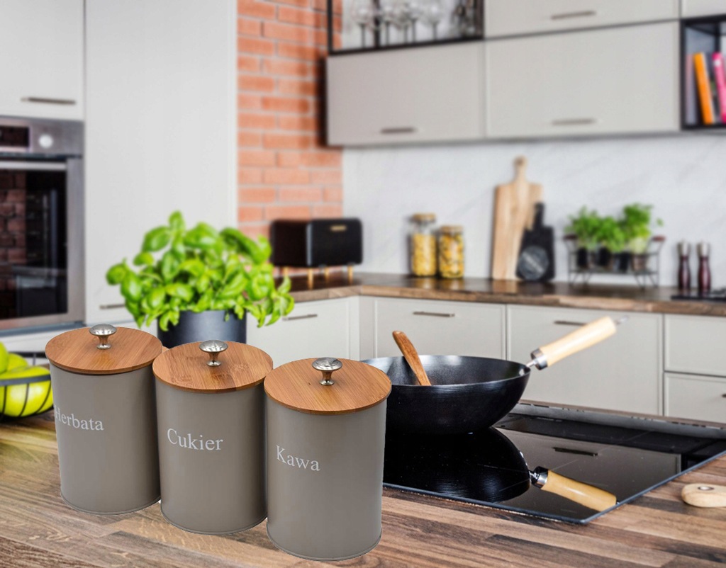 Zestaw 3 pojemników z pokrywkami bambusowymi do przechowywania produktów sypkich.