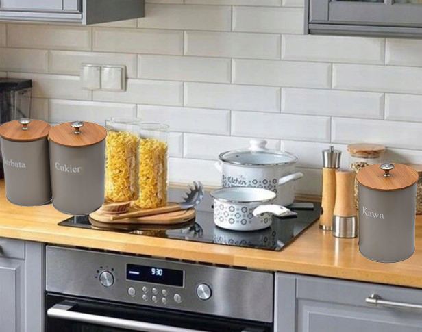 Na pojemnikach napisy Kawa, Herbata, Cukier.