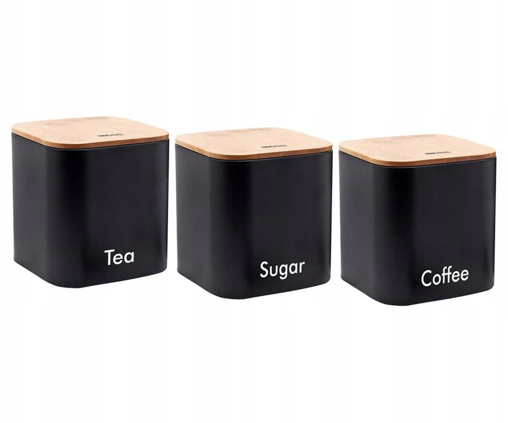 Na pojemnikach napisy Sugar, Coffee, Tea.