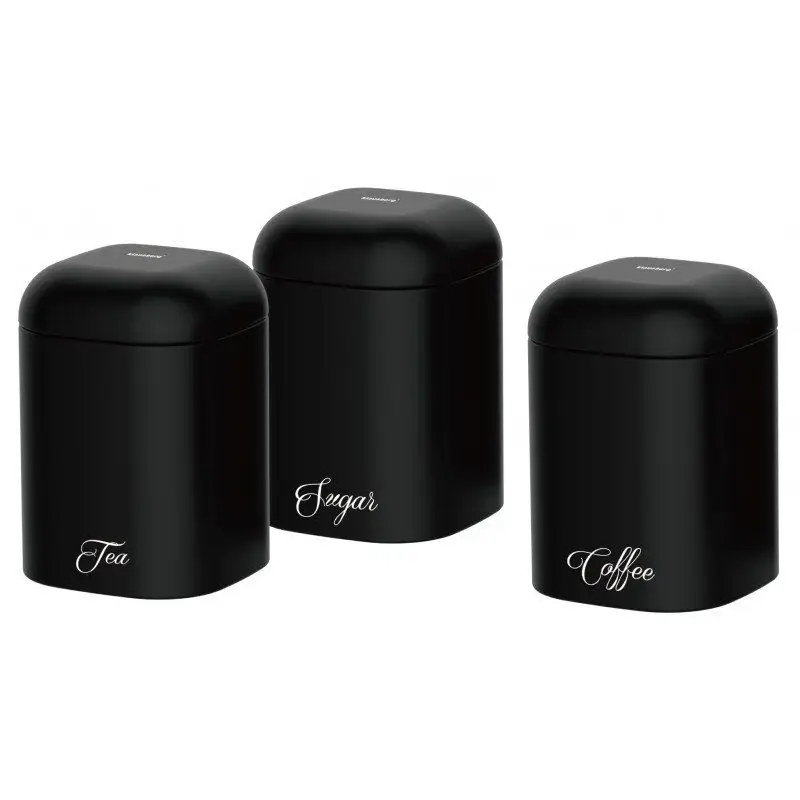 Na pojemnikach napisy Sugar, Coffee, Tea.