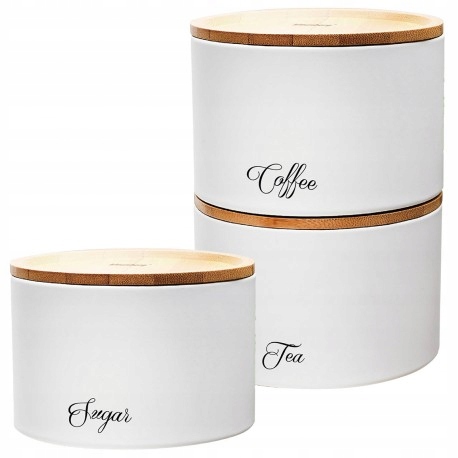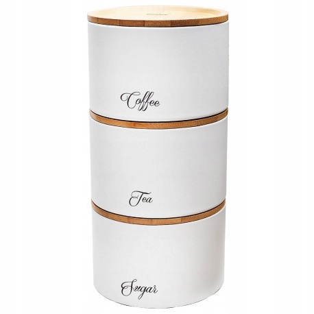 Na pojemnikach napisy Sugar, Coffee, Tea.