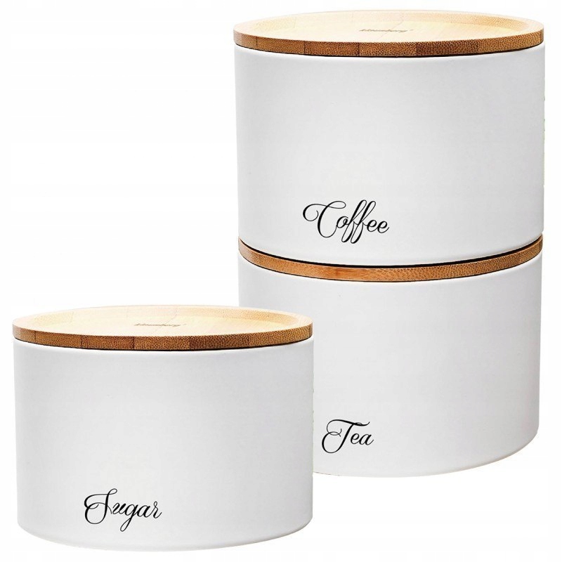 Na pojemnikach napisy Sugar, Coffee, Tea.