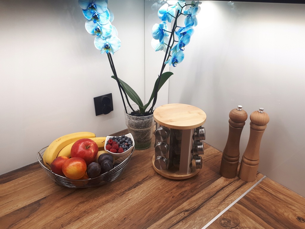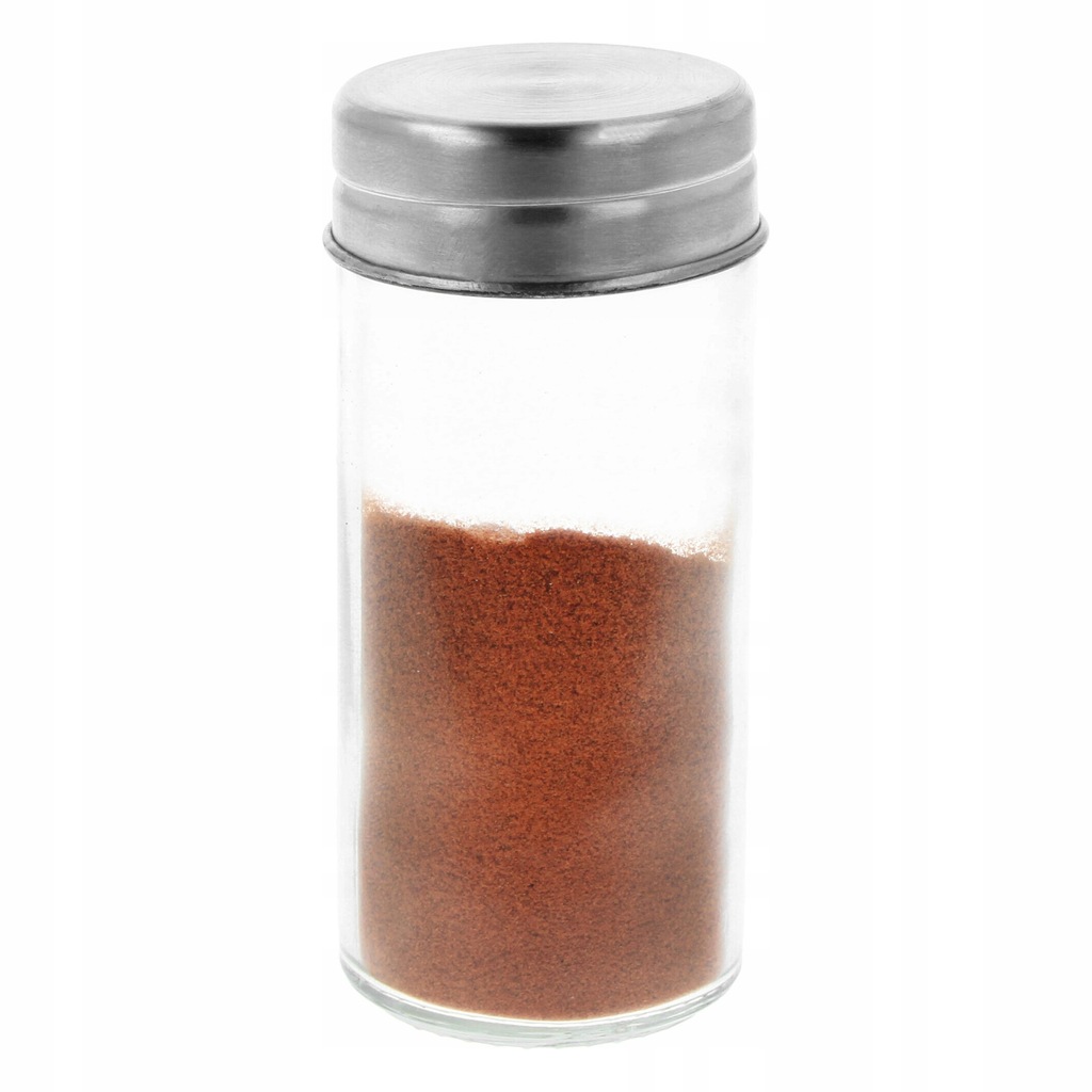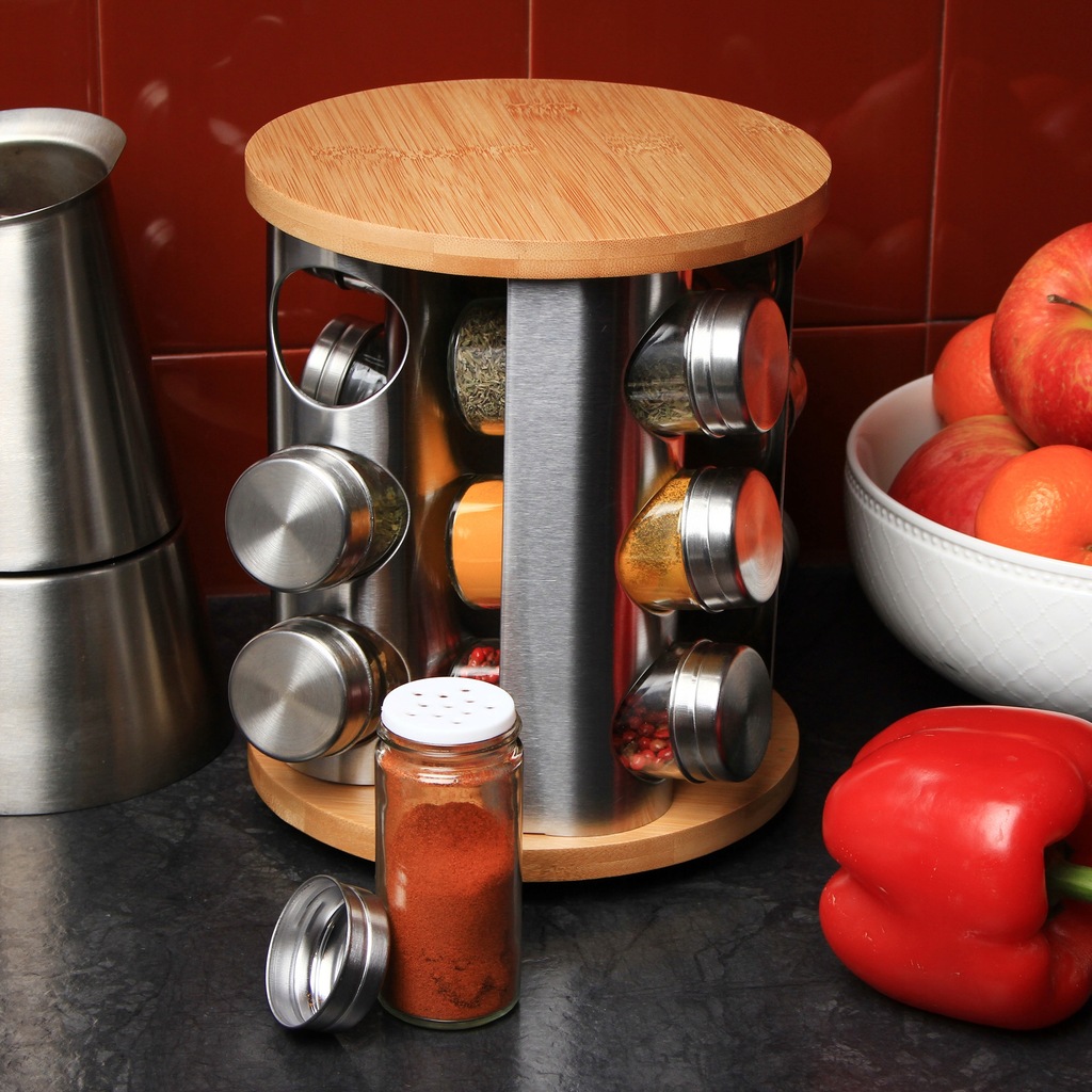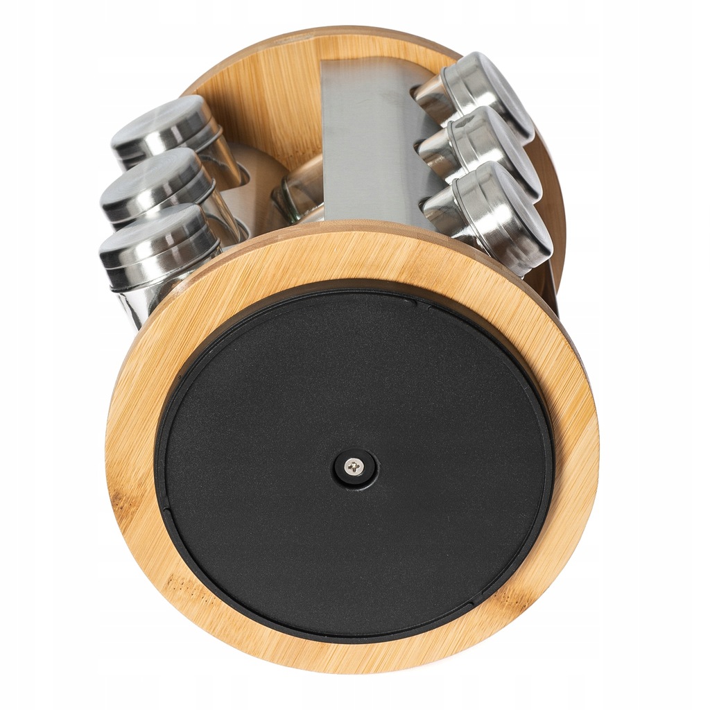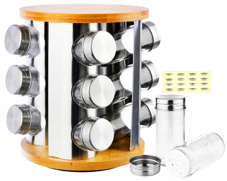 Zestaw 12 pojemników szklanych na obrotowym stojaku BRUNBESTE wykonany ze stali nierdzewnej w kolorze srebrnym połączonej z drewnem. Pojemniczki wykonane z grubego szkła, zamykane kapslem stalowym. Pod kapslem znajduje się zatyczka z dziurkami służąca do posypywania. Stojak obraca się na obrotowej podstawie wokół własnej osi 360 st.
