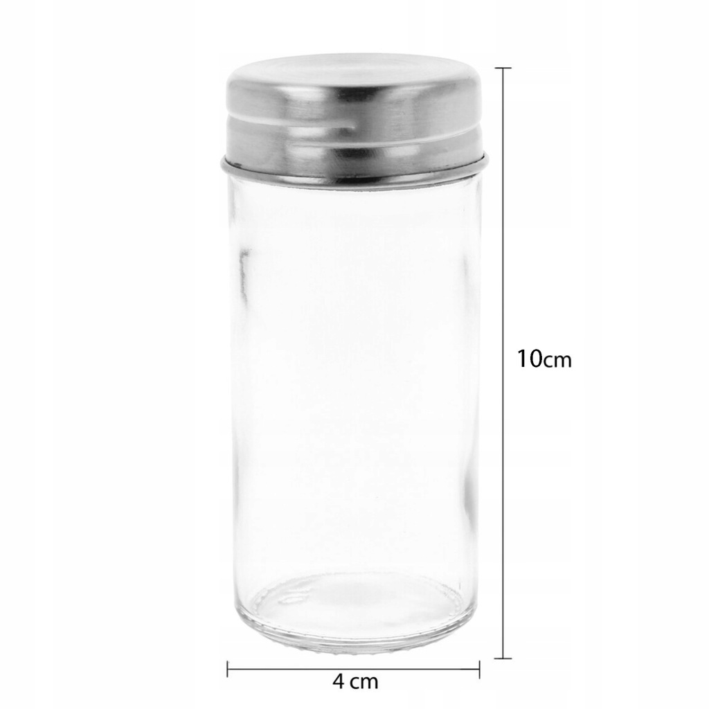 W zestawie 12 pojemników szklanych z nakrętką metalową i stojak.