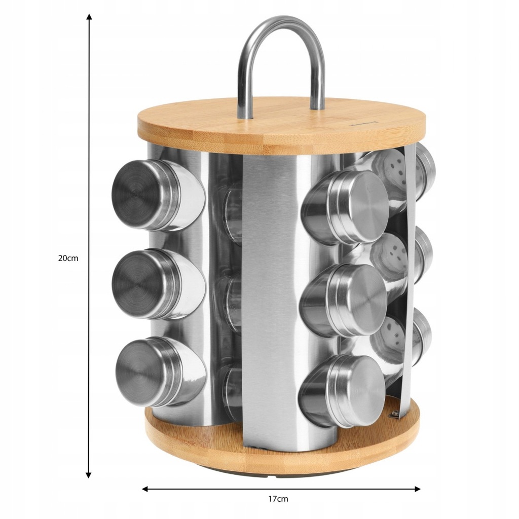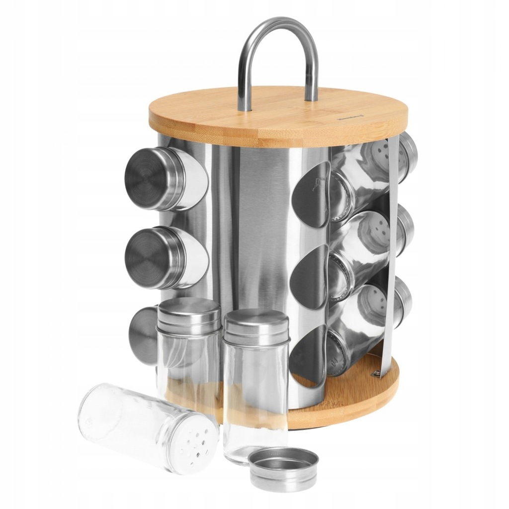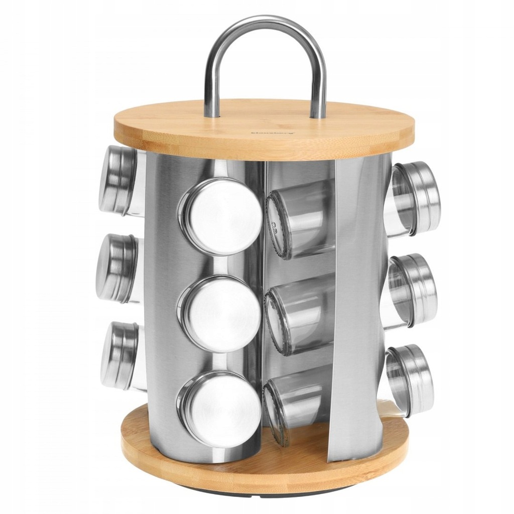 Zestaw 12 pojemników szklanych na obrotowym stojaku KINGHOFF wykonany ze stali nierdzewnej satynowej oraz drewna bambusowego. Pojemniczki wykonane z grubego szkła, zamykane kapslem stalowym. Pod kapslem znajduje się zatyczka z dziurkami służąca do posypywania. Stojak obraca się na obrotowej podstawie wokół własnej osi 360 st.