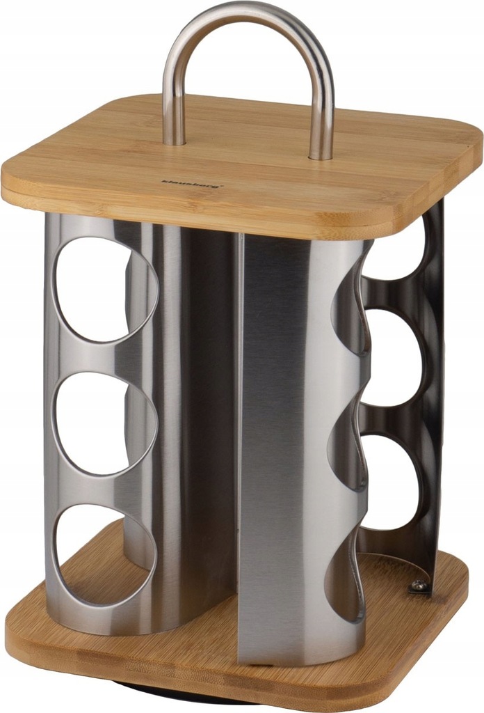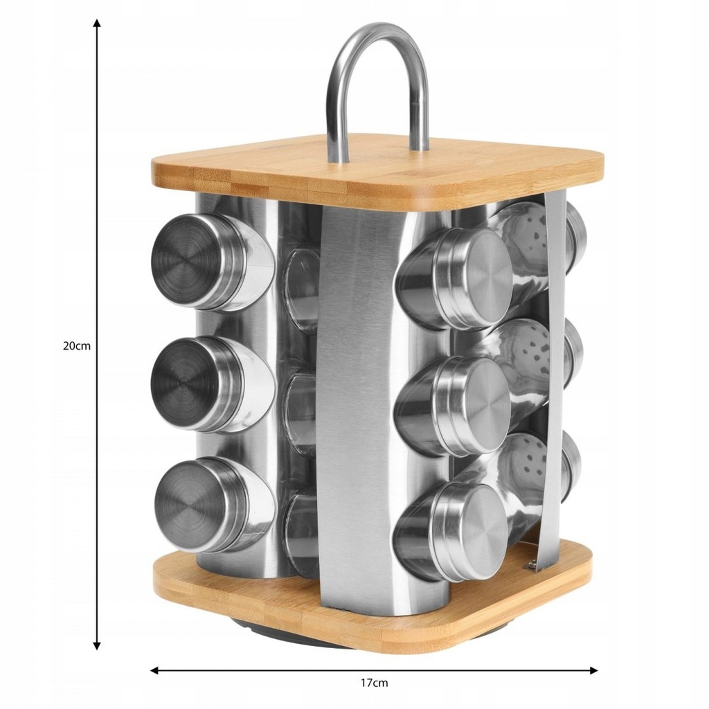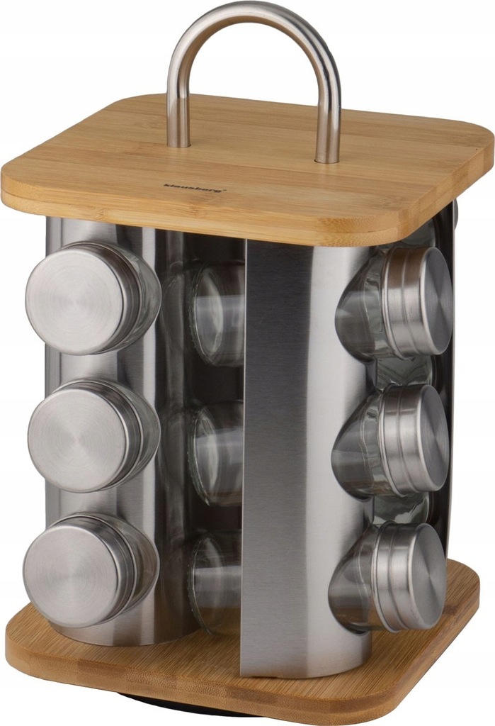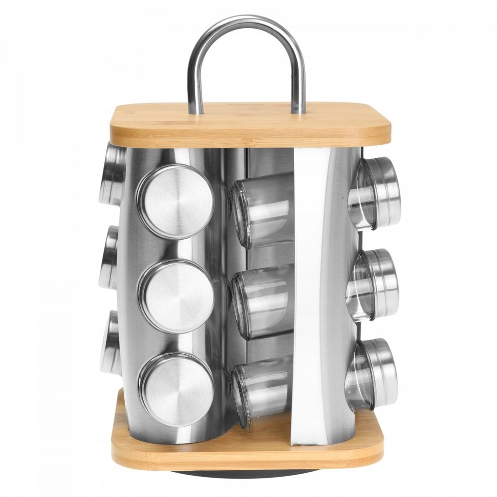 Zestaw 12 pojemników szklanych na obrotowym stojaku KINGHOFF wykonany ze stali nierdzewnej satynowej oraz drewna bambusowego. Pojemniczki wykonane z grubego szkła, zamykane kapslem stalowym. Pod kapslem znajduje się zatyczka z dziurkami służąca do posypywania. Stojak obraca się na obrotowej podstawie wokół własnej osi 360 st.