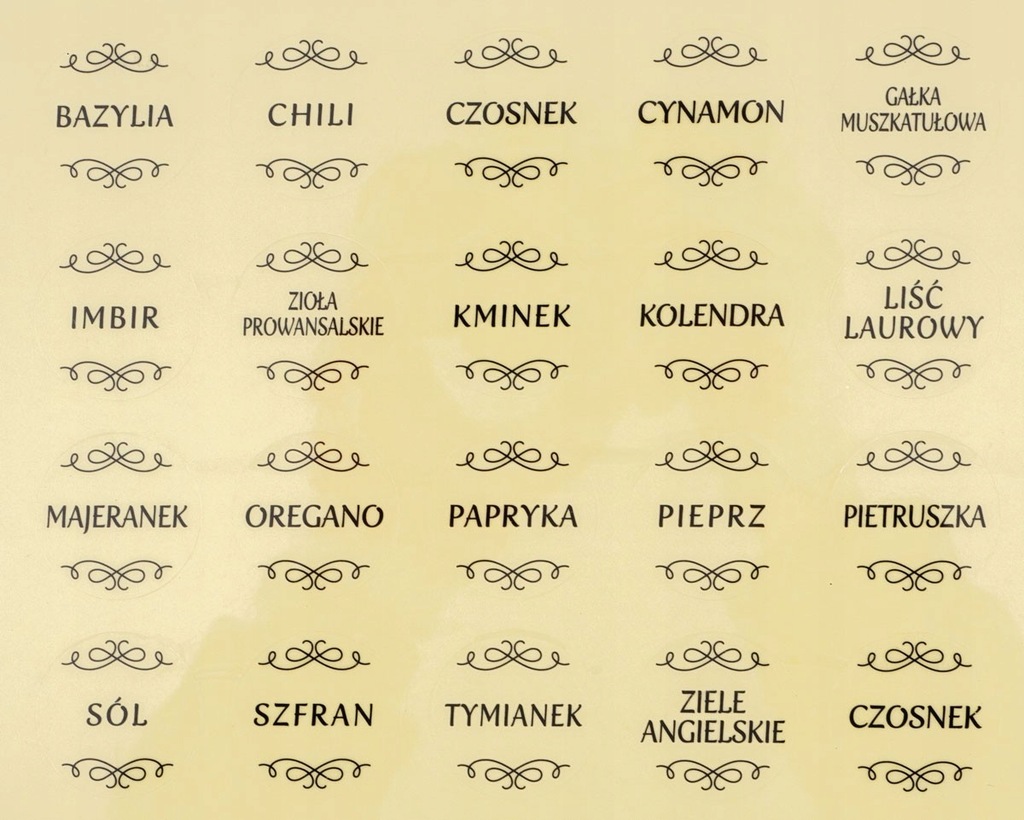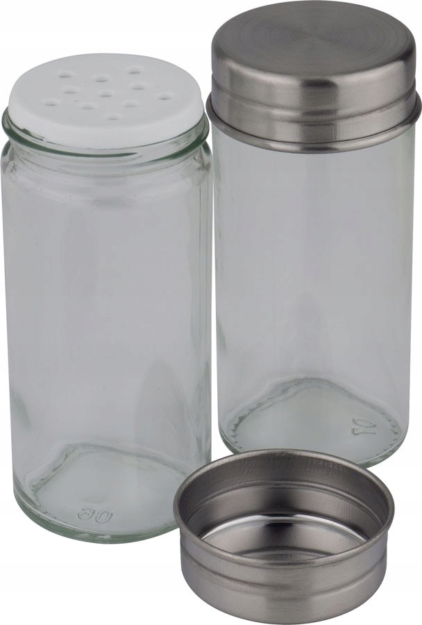 W zestawie 12 pojemników szklanych z nakrętką metalową i stojak obrotowy.