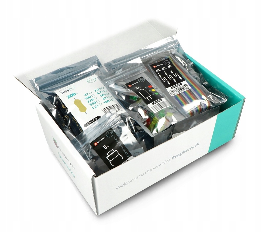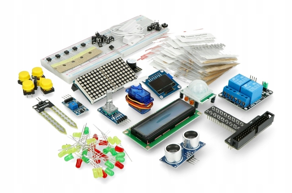 Zestaw składający się z elementów prototypowych, które można wykorzystać wraz z każdą wersją Raspberry Pi wyposażoną w 40-pinowe złącze GPIO. Z tym zestawem poznasz zasady działania poszczególnych elementów elektronicznych oraz programowania w języku Python. Zestaw zawiera m.in. przewody połączeniowe, płytkę stykową, różnego rodzaju czujniki, wyświetlacze, serwo i wiele więcej.